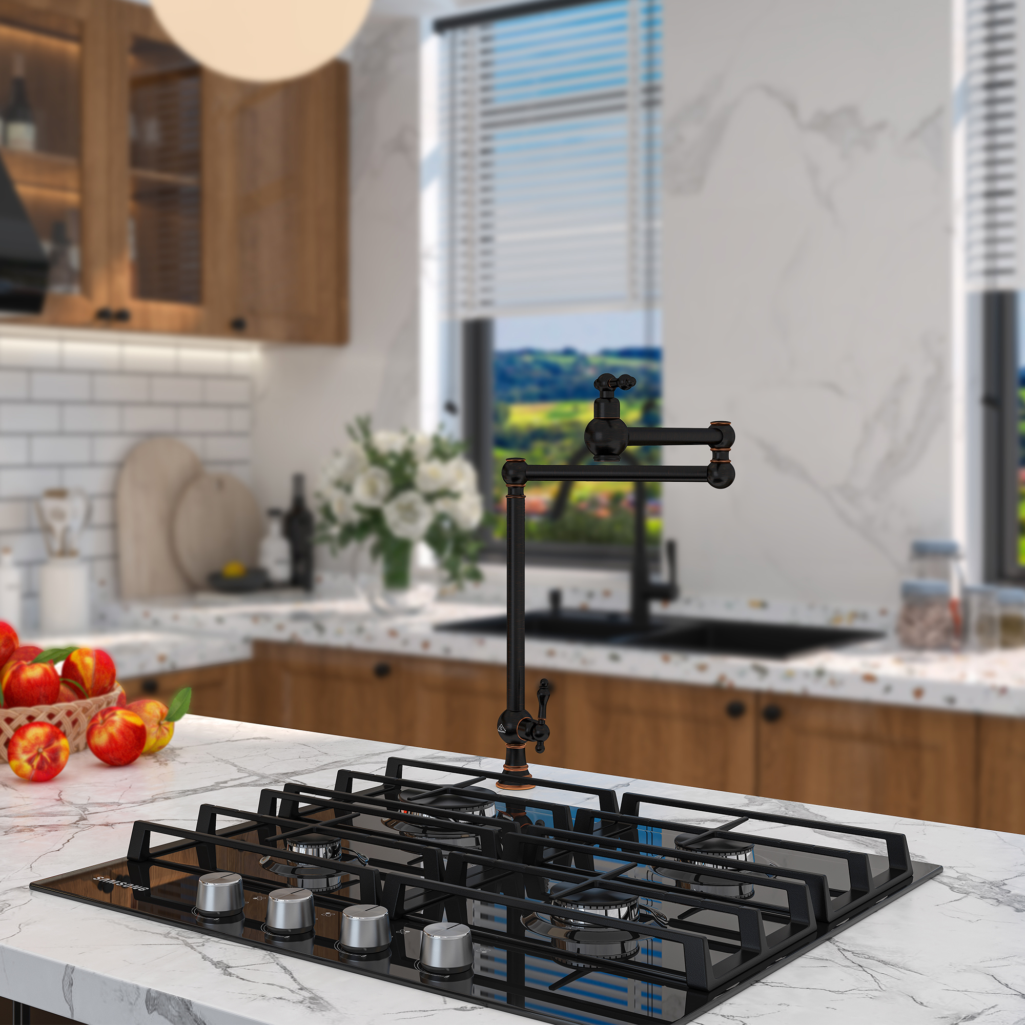 Pot filler faucets are wall-mounted faucets typically installed near the stove or cooktop. These wall-mounted faucets feature a long, swinging spout that can be extended to fill large pots and pans directly on the cooking surface, eliminating the need to carry heavy pots from the large sink. Pot filler faucets are a popular choice for gourmet kitchens and avid cooks who frequently prepare large meals.