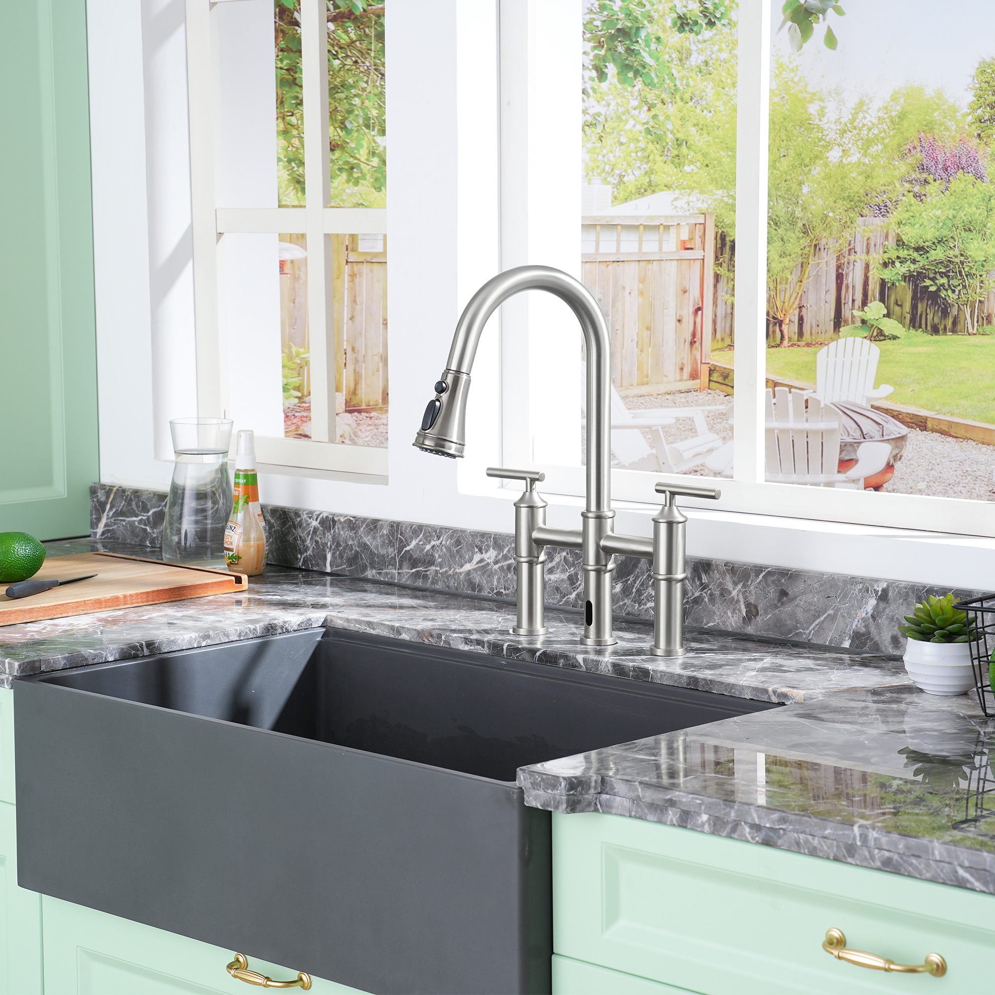 Bridge faucets feature dual handles connected by a visible horizontal pipe leading to the central spout. One handle controls hot water, the other cold. This elegant construction shines in farmhouse or traditional kitchen aesthetics and requires adequate sink deck space for both handles and the spout.