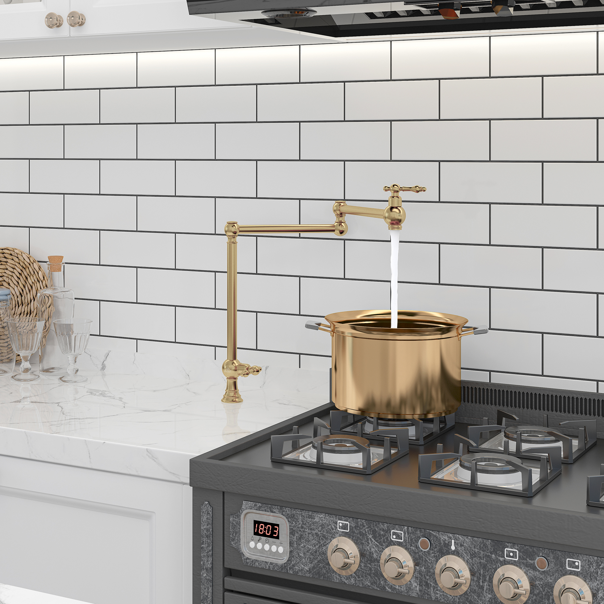 Bring European-inspired luxury to your kitchen with wall-mounted fixtures positioned above your stove. These eliminate the dangerous task of carrying heavy, water-filled pots from sink to stove. If you cook frequently and are designing your dream kitchen, this indulgent feature might be exactly what you're envisioning.