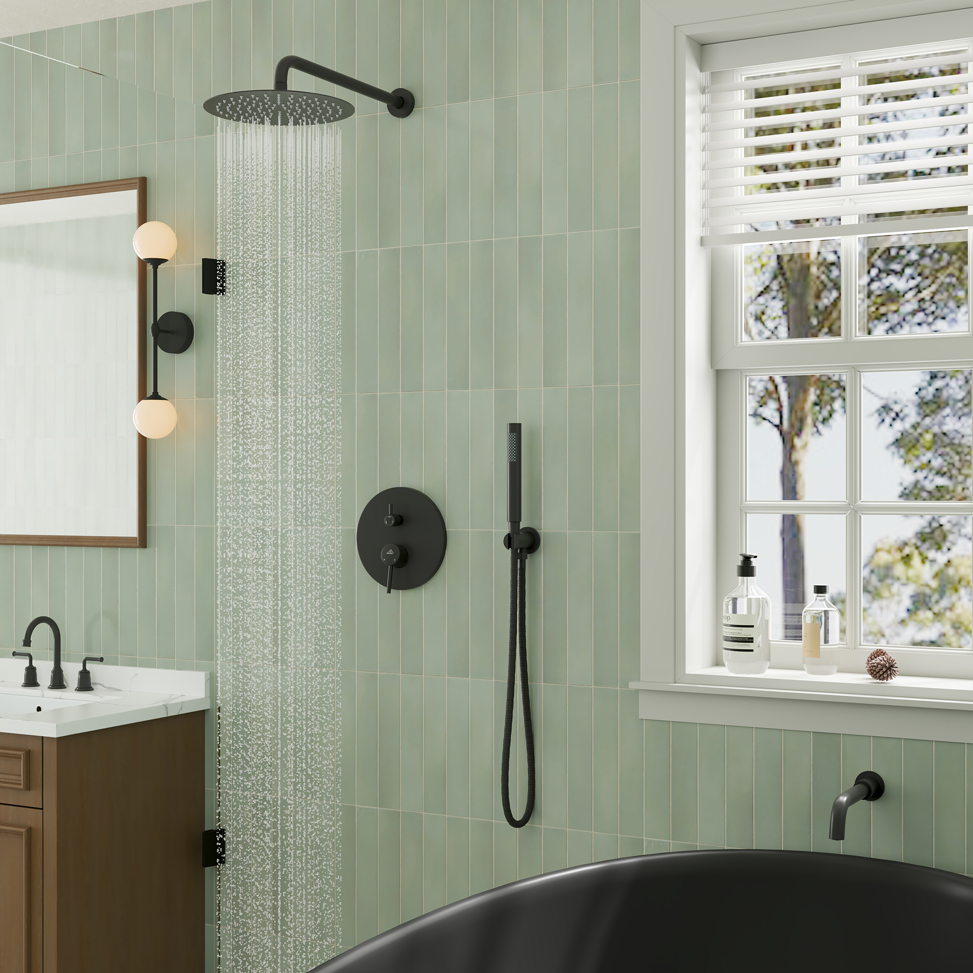 Securely install the showerhead, tub spout, and hand shower. Then test all the functions of the Complete Shower System.