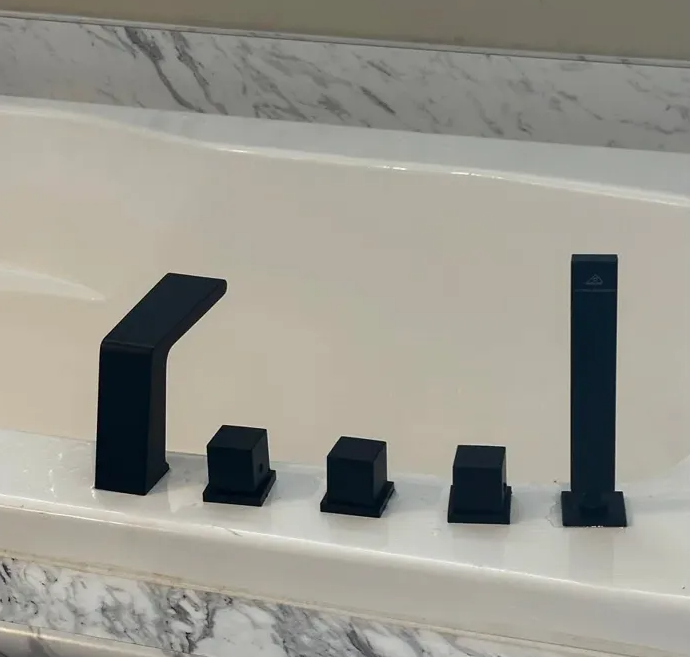 This 5-hole deck-mounted bathtub faucet uses Korean high-quality brass valves, which is durable