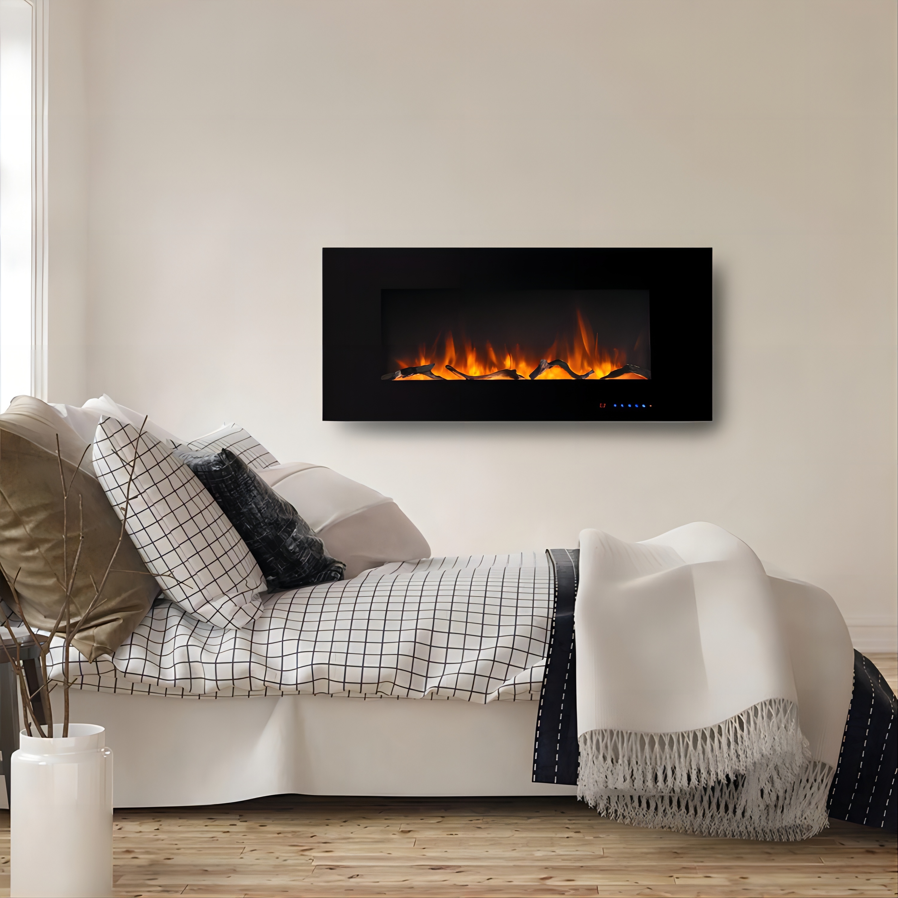 This fireplace is designed for wall-mounted installations. Beautiful flames to add new decorations to your home. Light plays through different size pieces and sparkles in a spectrum of colors.