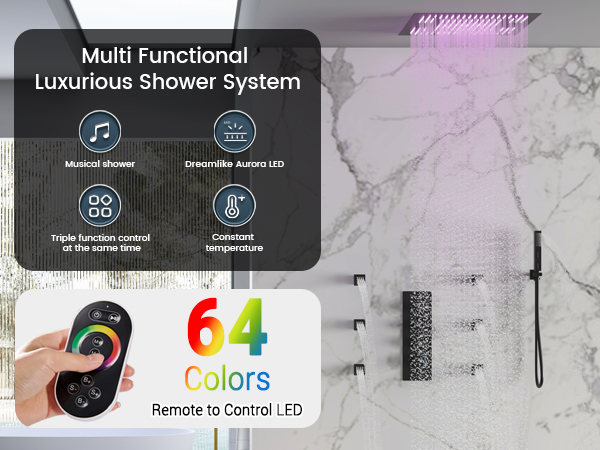 Features thermostatic control, a rainfall showerhead, and built-in LED lighting for a consistently comfortable shower experience.