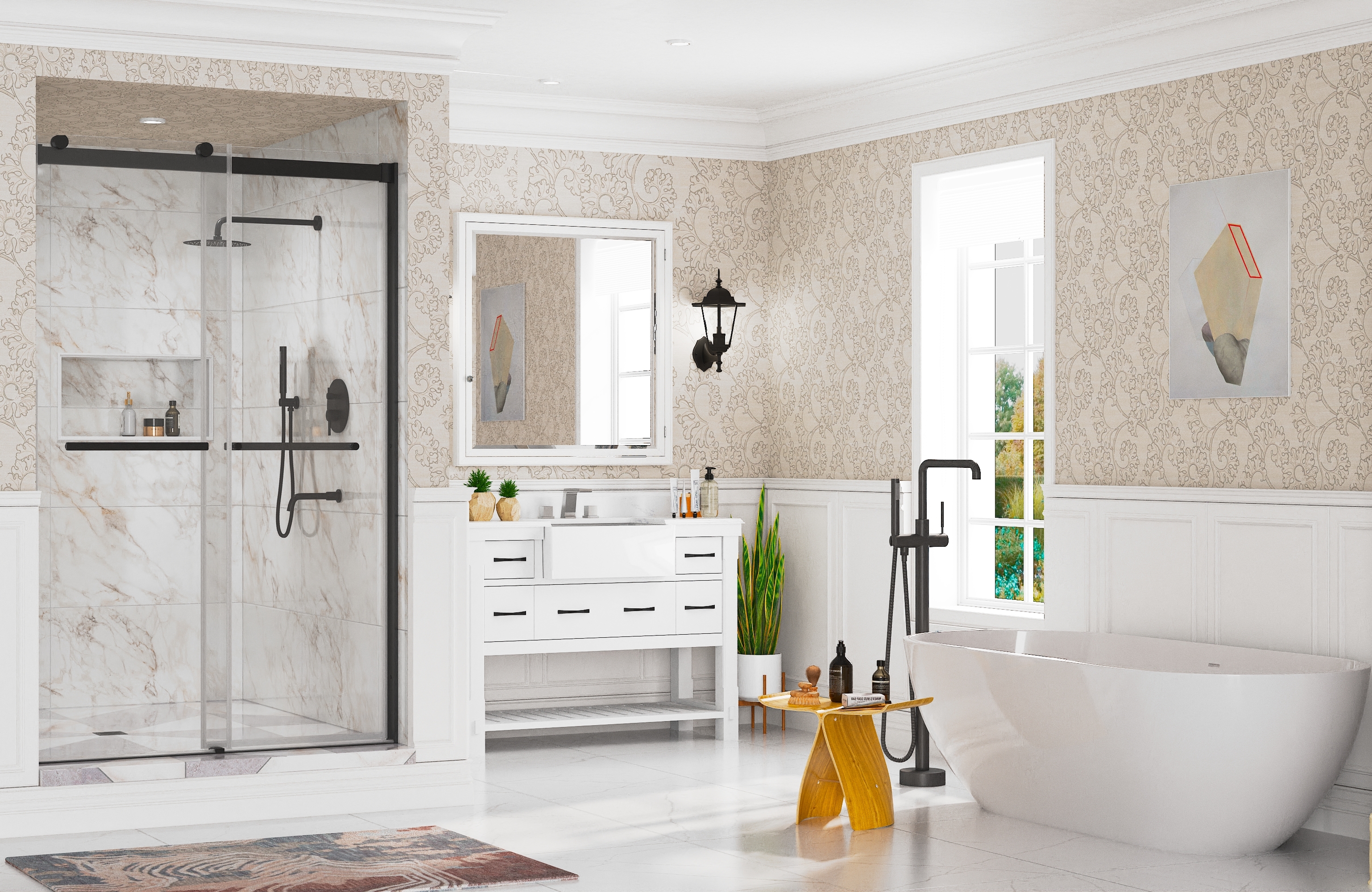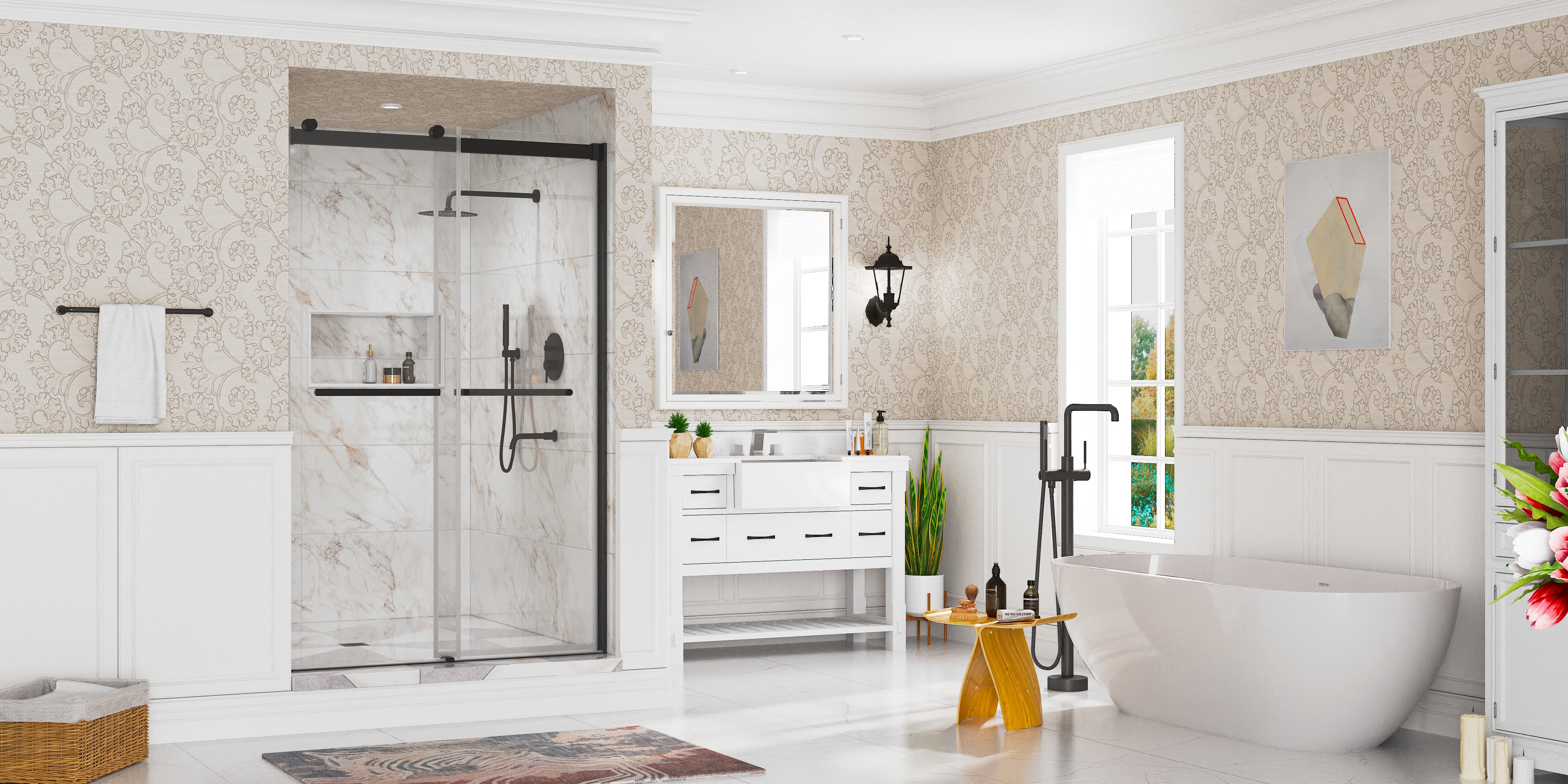 Includes sink faucet with waterfall spout, and bathtub faucet with a handheld showerhead, providing precise control for a serene filling experience.