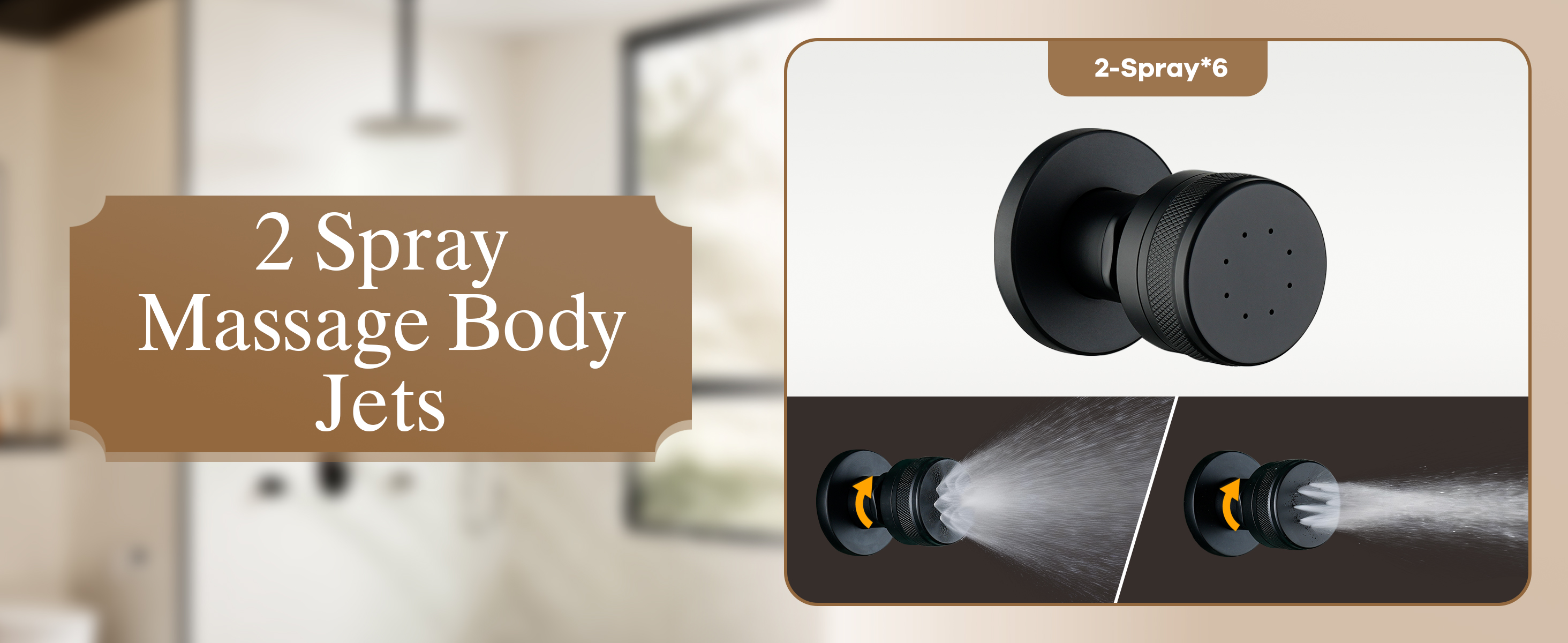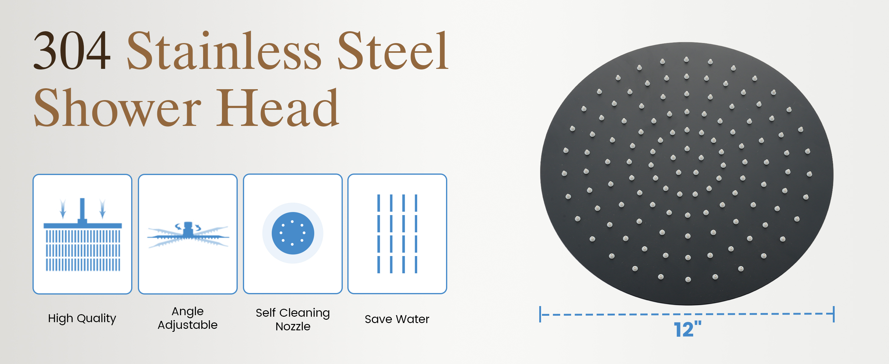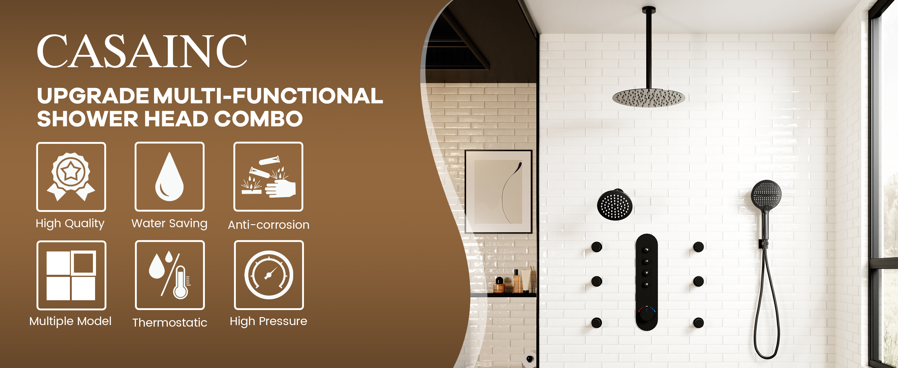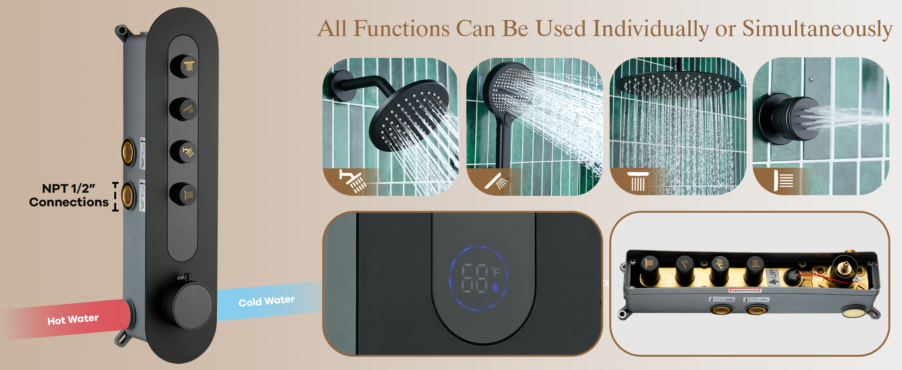 Experience a spa-inspired shower with this digital thermostatic multi-function shower system, designed for precision, comfort, and modern style. The 4-function digital thermostatic valve displays temperature in Fahrenheit, ensuring stable and safe water control throughout your shower. Dual overhead showerheads—a 12" slim rainfall head and a 6" thick overhead head—work together with six body jets to deliver immersive, full-body water coverage.