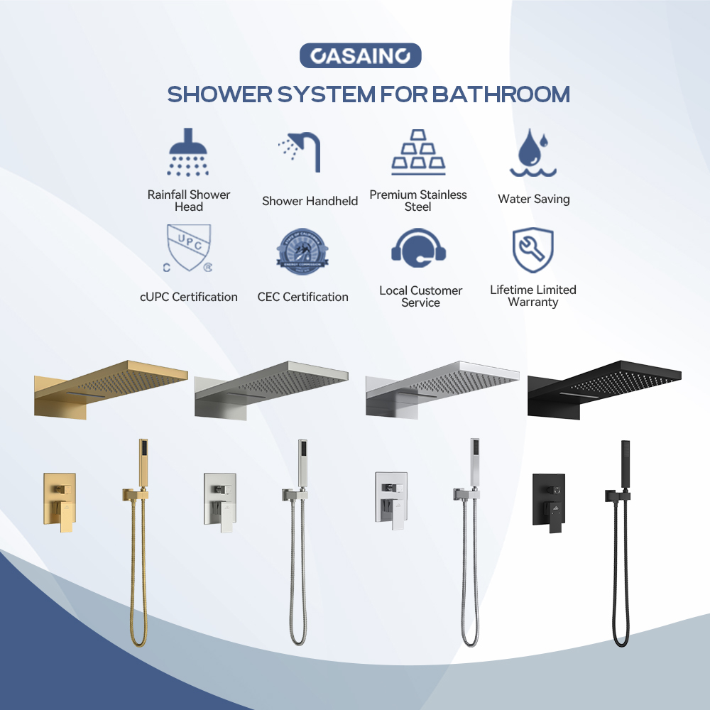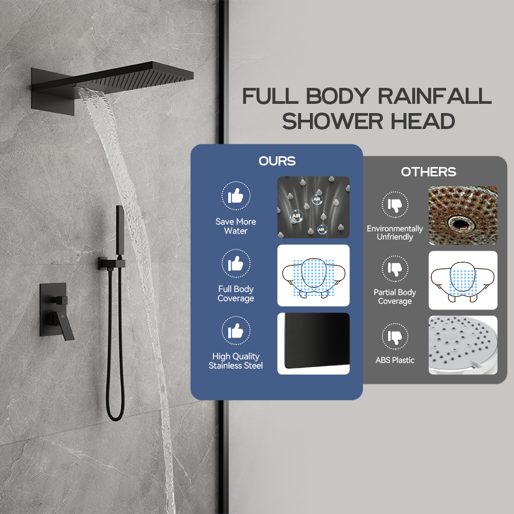 This 22-inch 3-way shower system features an oversized shower head with switchable rainfall and waterfall spray modes, paired with a flexible handheld sprayer for everyday use. The concealed installation keeps the shower wall clean and uncluttered. Designed for comfort and safety, it delivers steady water flow and reliable temperature control for modern homes.