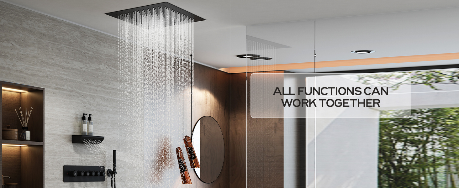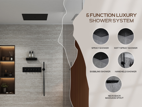 Casainc's 5-function luxury thermostatic shower system is the epitome of modern luxury, seamlessly blending functionality with style. With its sleek matte black finish, it adds a touch of sophistication to any bathroom decor. This ceiling-mounted shower system boasts a 23.6-inch large showerhead, which features multiple functions including a big spray, small spray, and bubbling option, catering to diverse preferences. Accompanying the showerhead is a hand shower, providing added flexibility for targeted rinsing. Moreover, the system includes a neck massage spout, delivering a soothing water column directly to the neck area for ultimate relaxation.