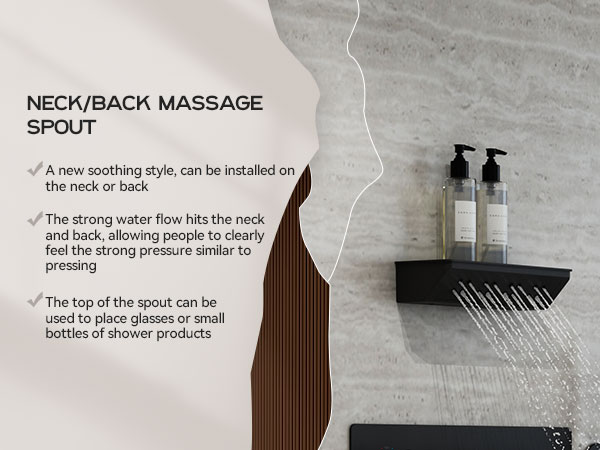 - Neck Massage Feature: Experience the rejuvenating sensation of targeted water jets aimed at your neck and back, simulating the effect of a professional massage. Complete with a convenient shelf for storage, it's designed to enhance your shower relaxation.