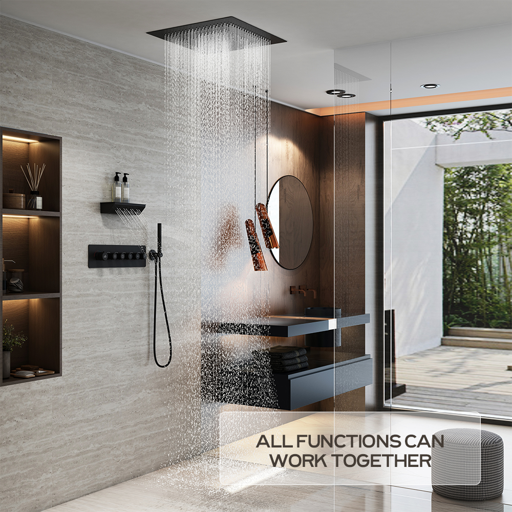 - Multifunctional Luxury Design: This matte black thermostatic shower system offers five functions, including dual stainless steel ring showerheads for a luxurious bathing experience. With a spacious 600x600mm overhead panel, it provides the ultimate indulgence in your bathroom.