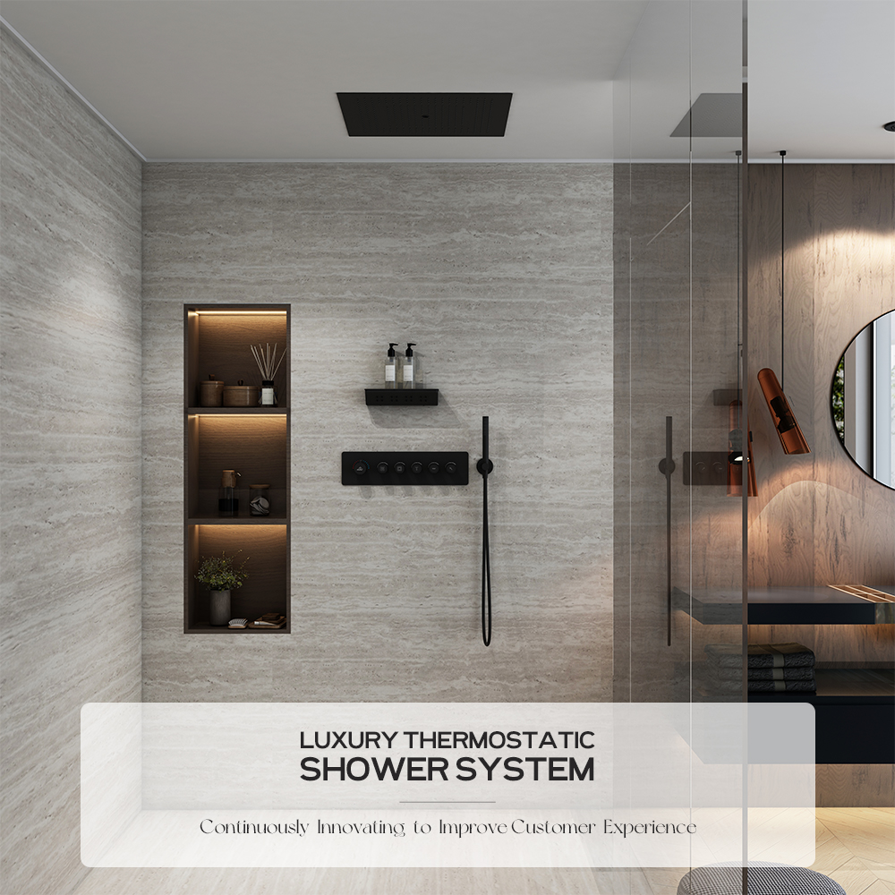 - Consistent Temperature Control: Equipped with a thermostatic valve set at 100°F, this luxury shower system ensures a steady water temperature, protecting you from scalding or discomfort even with fluctuating water pressure.
