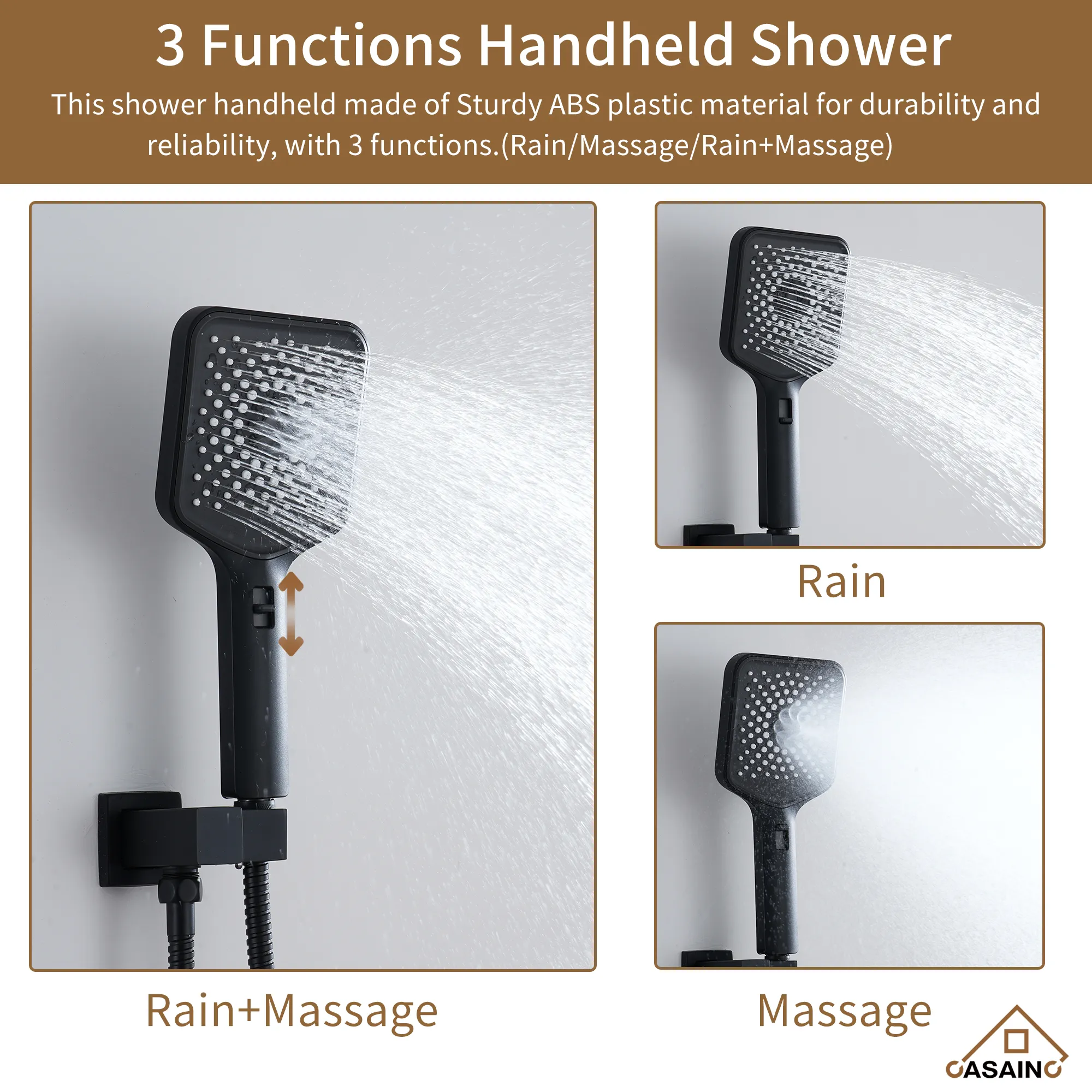 - 3 Functions Handheld Shower: Massage, rain, and rain+massage, can meet your different needs.