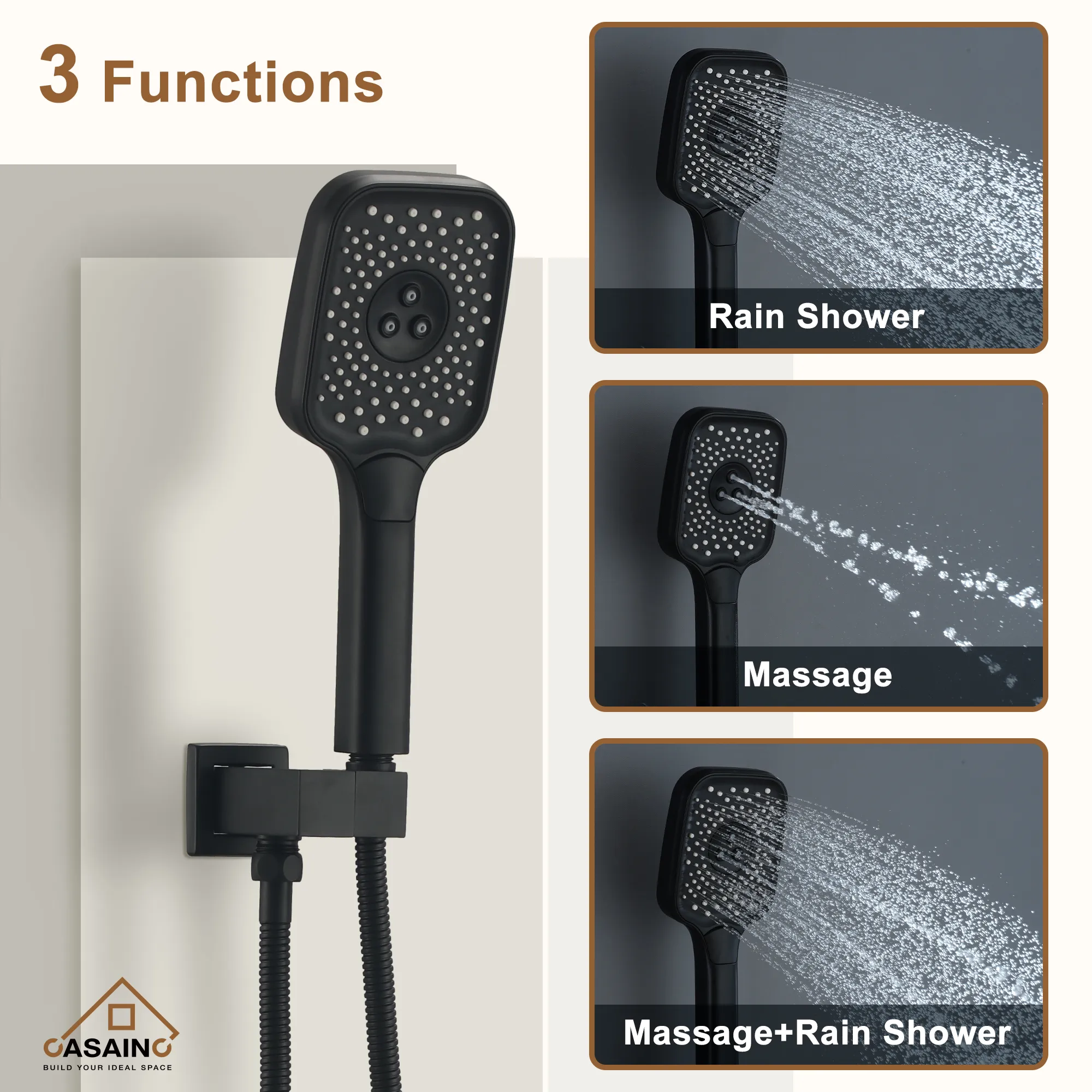 - Handheld shower can switch three functions through its button, including Rain Shower, Massage, Massage + Rain shower, three different shower modes to bring you a different experience