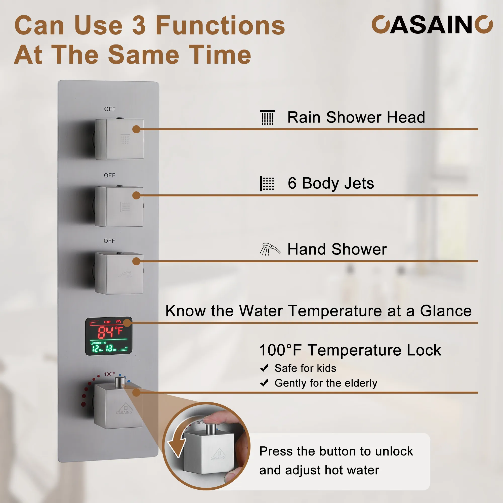 Escape to a world of relaxation with our luxury spa shower system, offering a harmonious blend of features. Enjoy the gentle embrace of the rainfall shower head, the versatility of the hand shower, and the invigorating massage from 6 body jets. Stay effortlessly with your preferences using the digital temperature display, and elevate your shower to new heights by activating all functions simultaneously for a spa-like immersion in luxury.