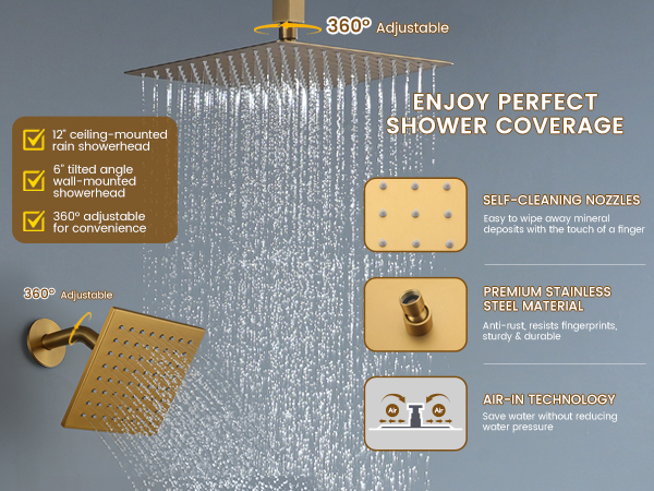 This product features a dual-shower design, comprising two shower heads with distinct functionalities. The ceiling-mounted shower head offers a 360-degree rotation capability, providing a versatile shower experience. Simultaneously, the wall-mounted variant seamlessly integrates into the bathroom decor, offering an additional showering option. With this combination, users can enjoy the flexibility of a rotating ceiling shower head and the convenience of a wall-mounted shower, enhancing their overall showering experience.