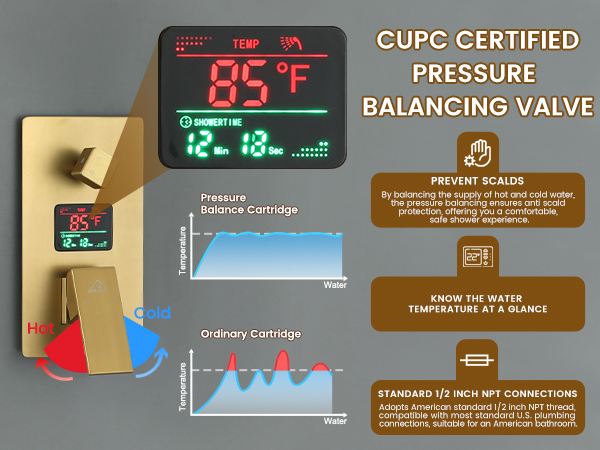 Balanced Valve Technology: Experience the benefits of the CUPC-certified balanced valve core; it ensures a stable water temperature and consistent water pressure