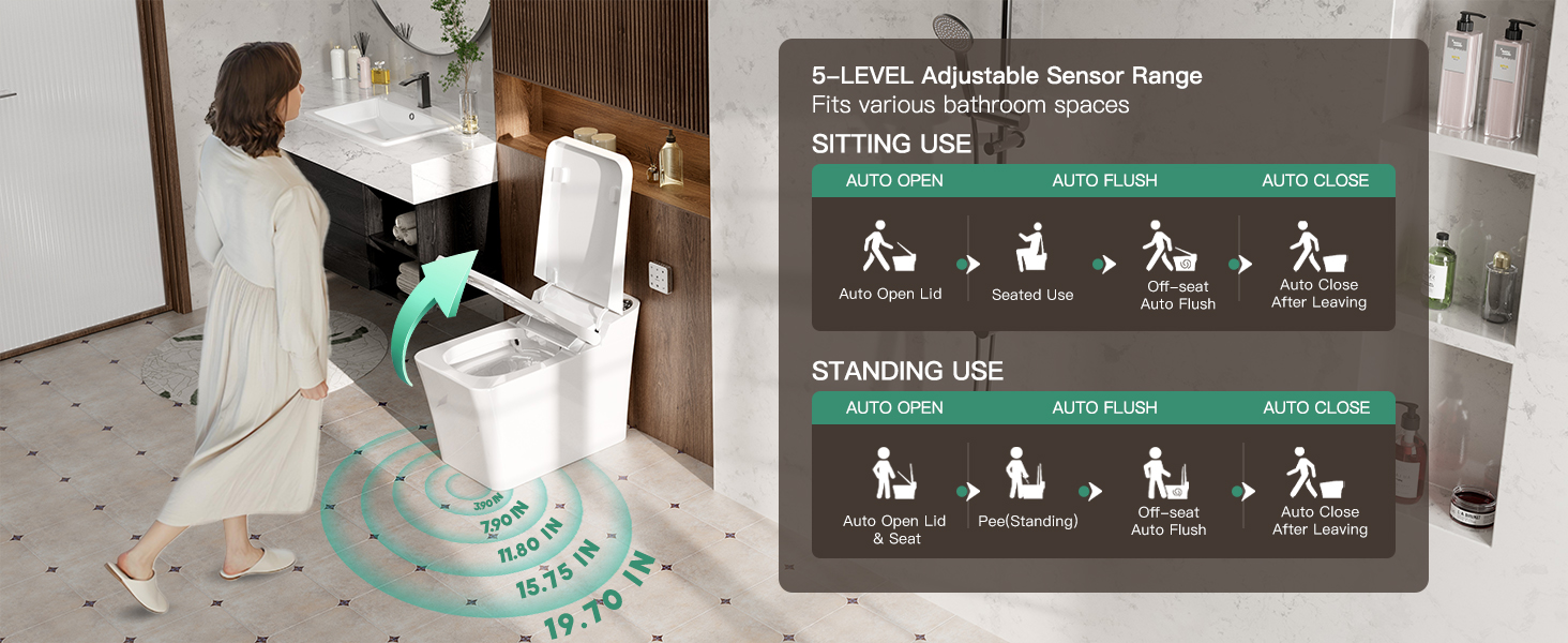 True Hands-Free Living: From the moment you walk up, the lid opens automatically—no bending, no touching, no hesitation. An adjustable radar sensor adapts to your space, and a foot-sensor lets you open the seat or flush with a simple approach, providing added convenience for men and minimizing contact in shared bathrooms.