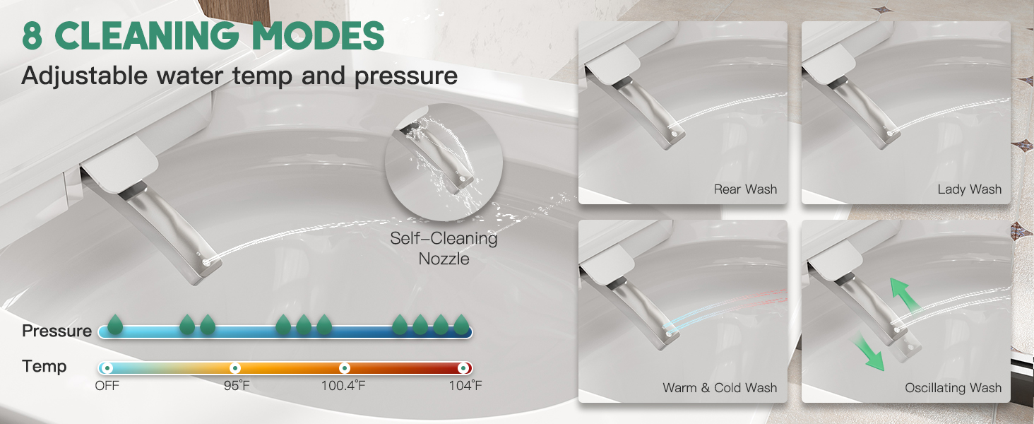 Spa-Inspired Cleansing: Choose from a full menu of comforts, including rear wash, feminine wash, oscillating cleanse, hot-and-cold massage, and a one-touch SPA mode. A nanobubble water stream delivers a gentler, deeper clean, while adjustable water temperature, pressure, and nozzle position allow a completely personalized experience.