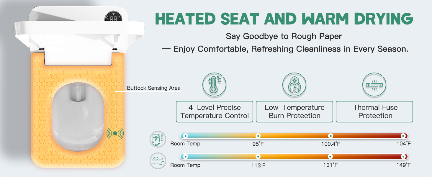 Fast Warm-Air Drying, Less Paper, More Comfort: A powerful 0.61 m³/min warm-air dryer with four heat levels leaves you feeling clean, dry, and refreshed while reducing toilet-paper waste for a more eco-friendly daily routine.