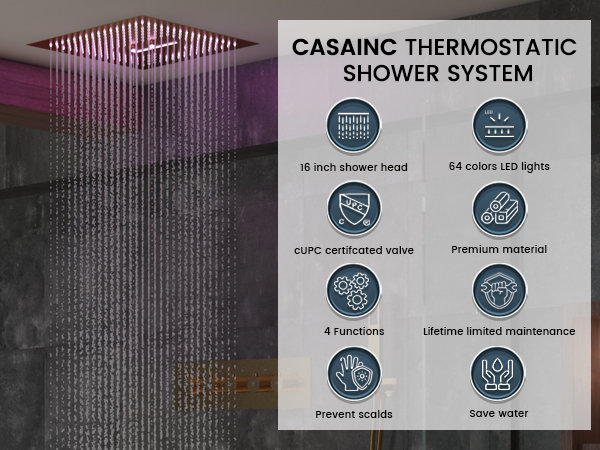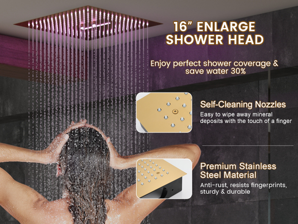 Luxury 16" Thermostatic Rain Shower System with 64-Color LED Lights