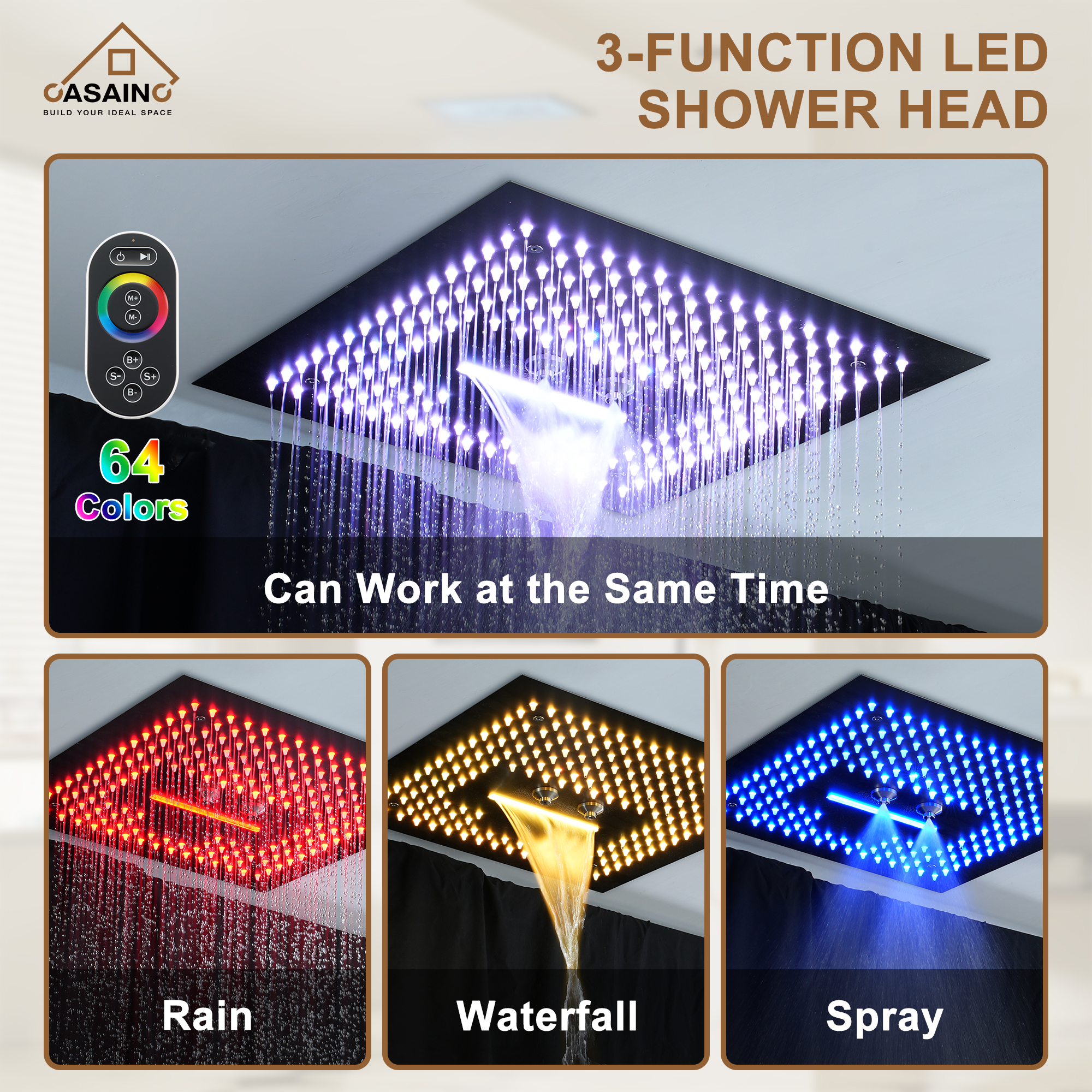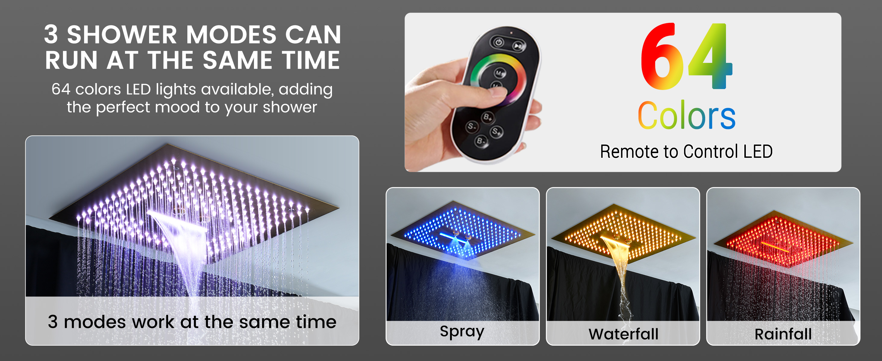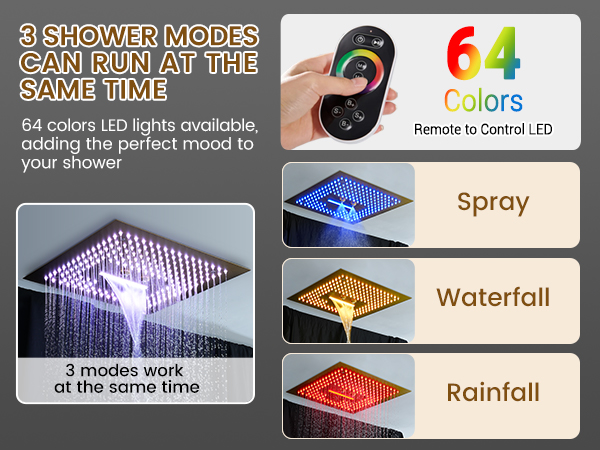 - Multifunctional shower head, you can replace 64 kinds of lights by remote control, rainfall, and negative ion function to give you a comfortable shower experience