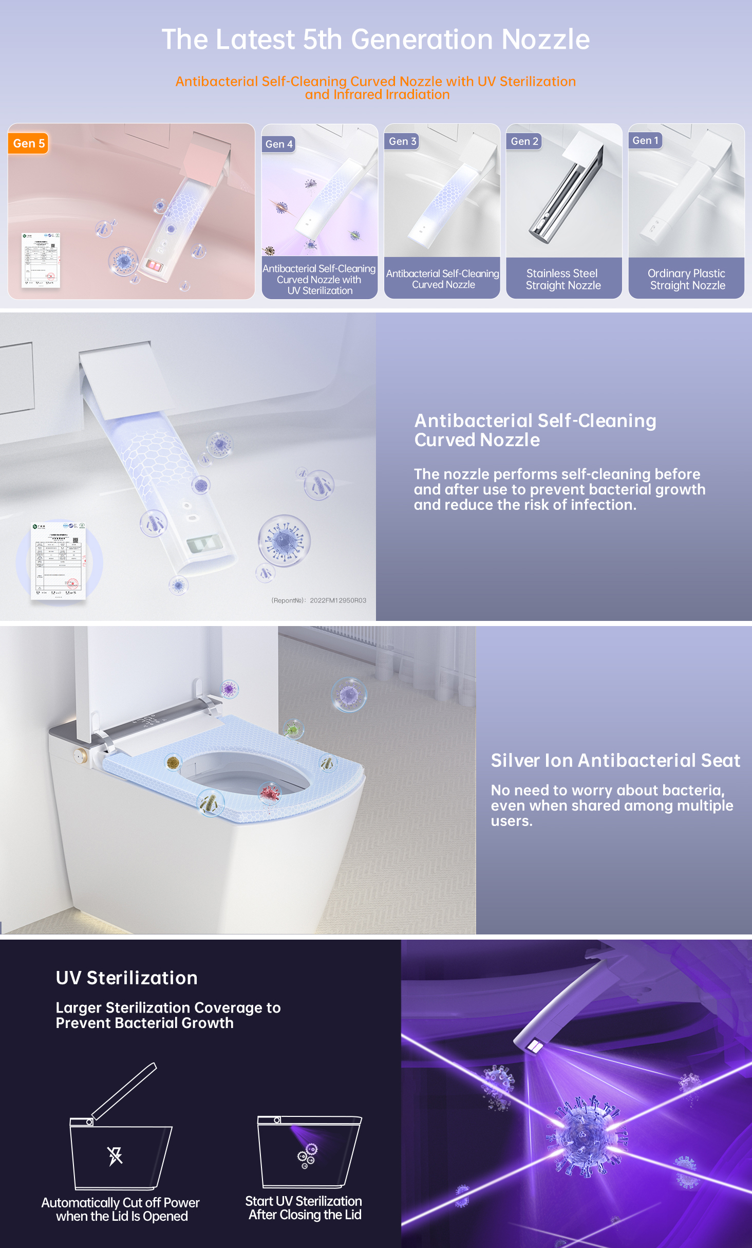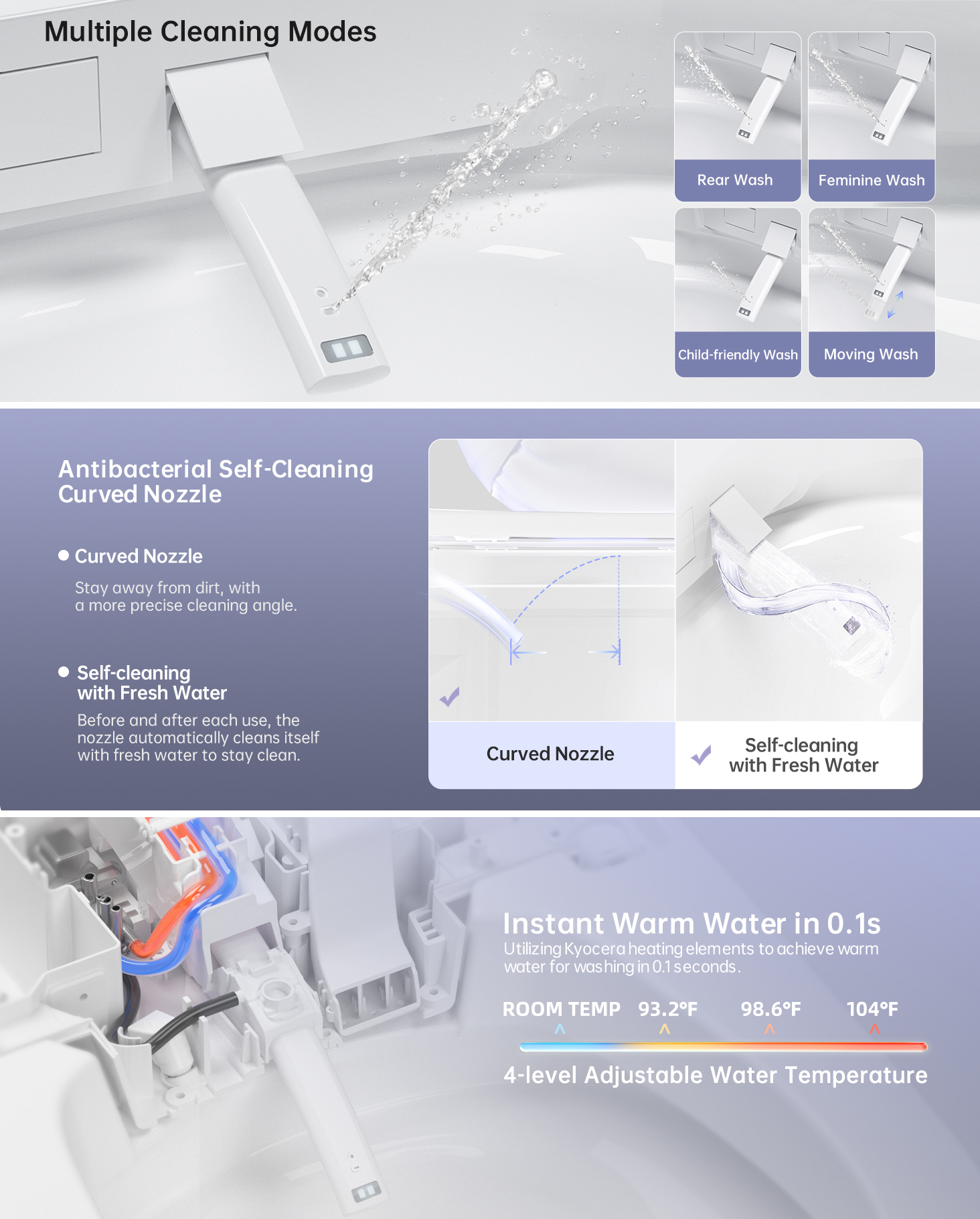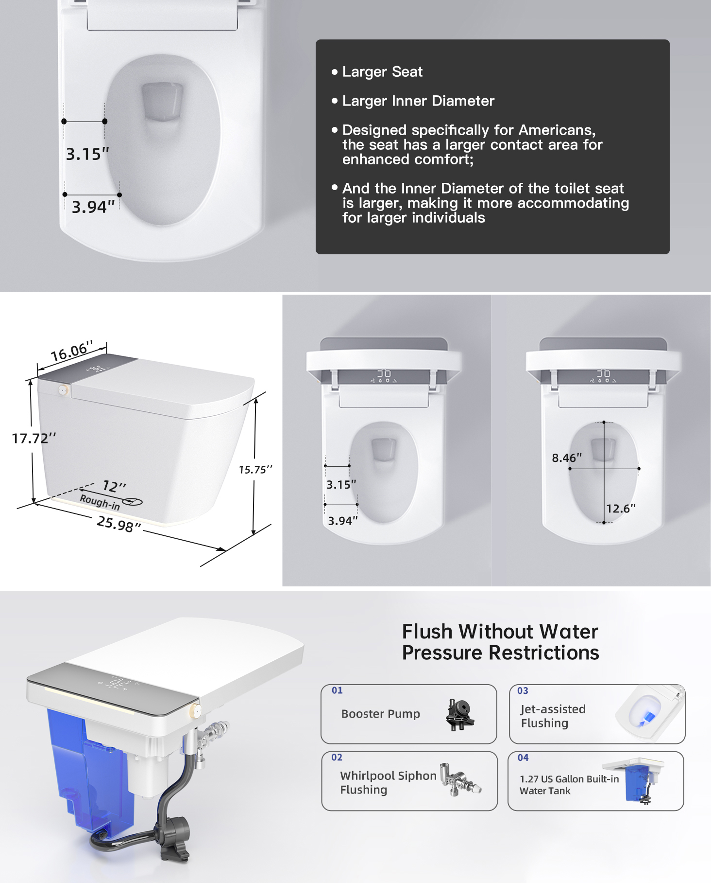 Reliable performance is ensured through a booster pump, vortex siphon system, jet-assisted sweep flush, and integrated water tank, providing strong, consistent flushing even in low-pressure environments. Designed with U.S. users in mind, the enlarged seat, ergonomic height, and minimalist modern form combine style and comfort in any bathroom.