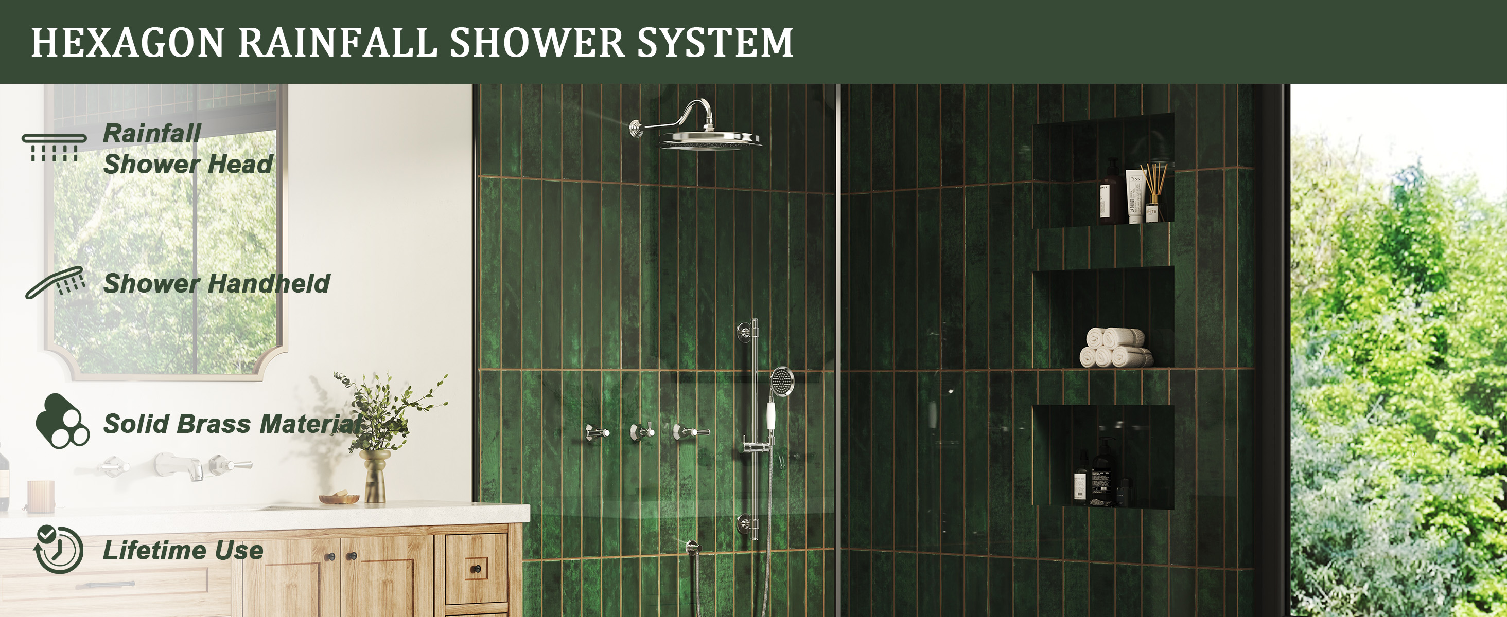 Featuring a non-pressure balanced valve, this system gives you manual mastery over water temperature with dedicated hot and cold handles, while the central diverter offers effortless switching between the oversized rain shower and hand shower. Forged from premium solid brass and finished to perfection, every component is designed to resist corrosion and aging, ensuring timeless beauty. With its architectural silhouette and flawless craftsmanship, HEXAGON is not merely a shower—it’s a statement of enduring elegance.