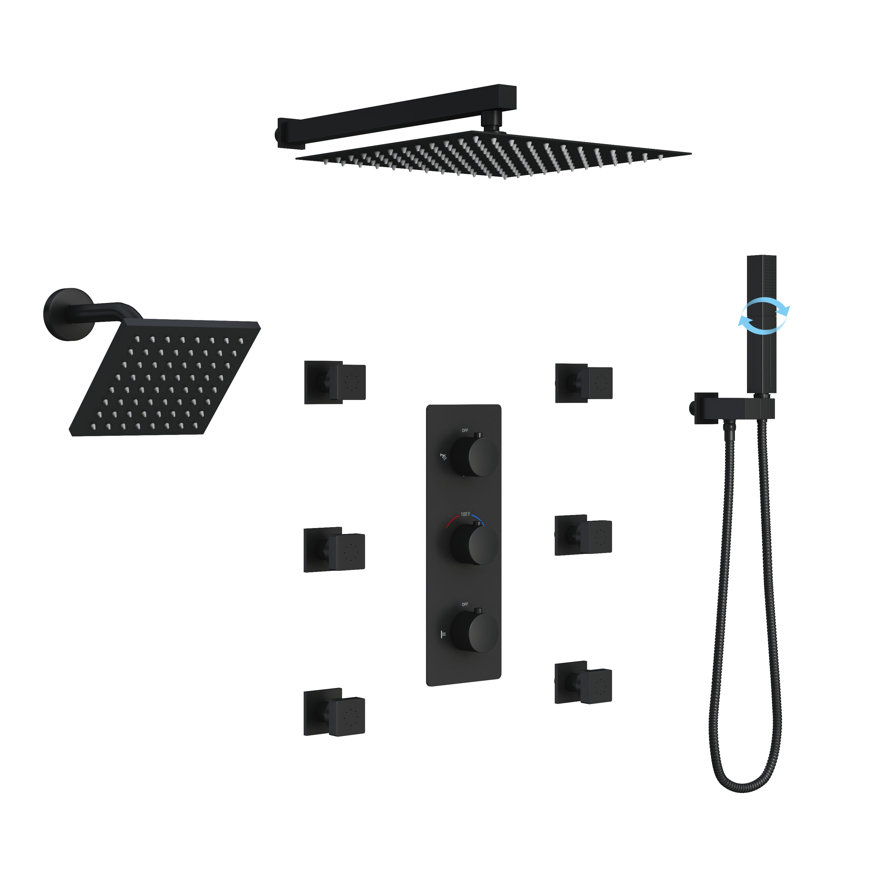 Upgrade your daily routine with this premium thermostatic shower system, designed to deliver precise temperature stability and a fully customizable spa-like experience. The 4-function thermostatic valve ensures smooth, consistent control, while dual ultra-slim overhead showerheads—12" and 6"—create immersive, balanced rainfall coverage. Six dual-function body jets provide soothing full-body hydrotherapy, and the square brass handheld with built-in spray-gun mode adds powerful versatility for targeted rinsing and cleaning.