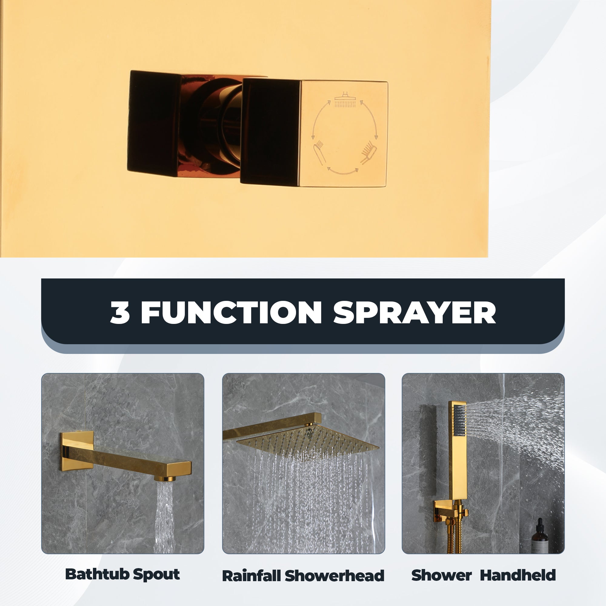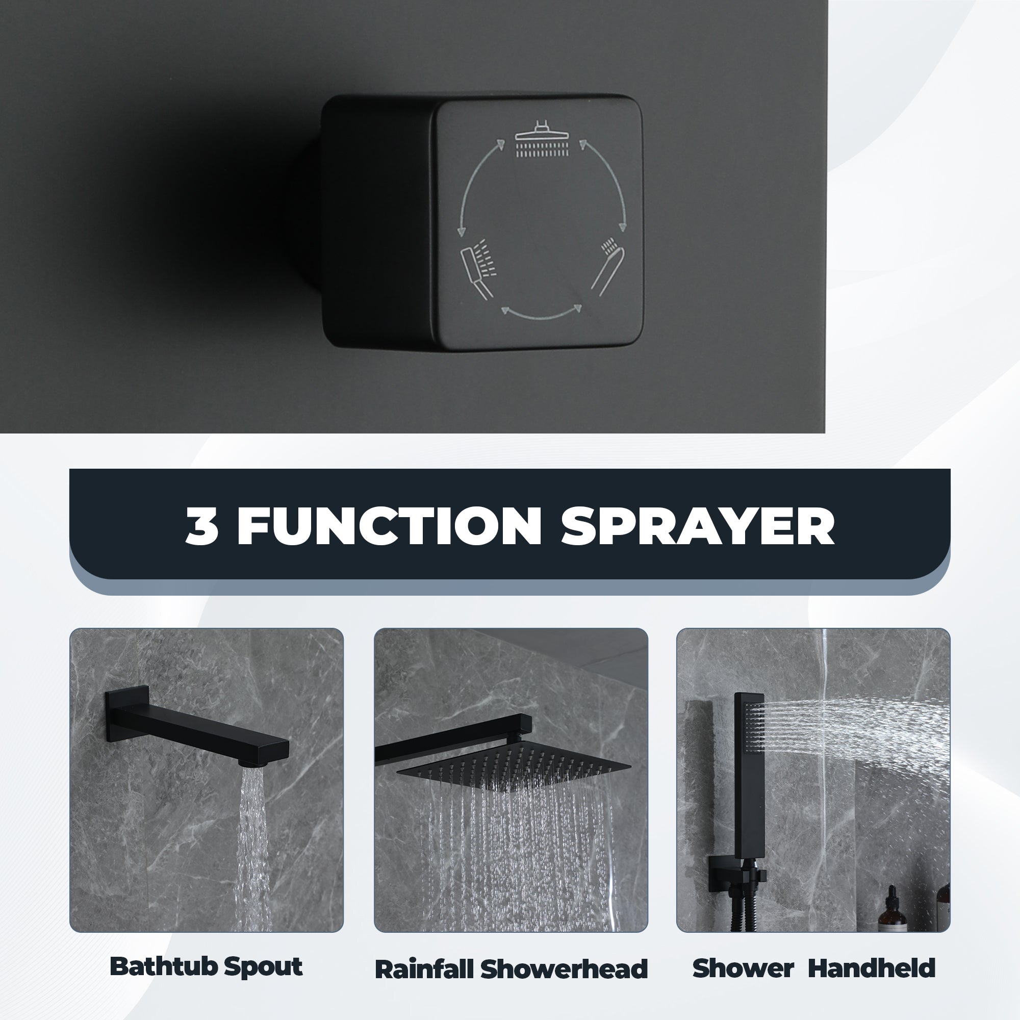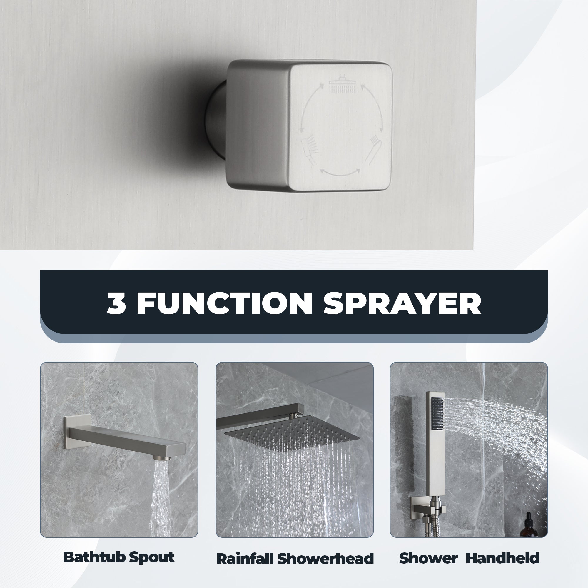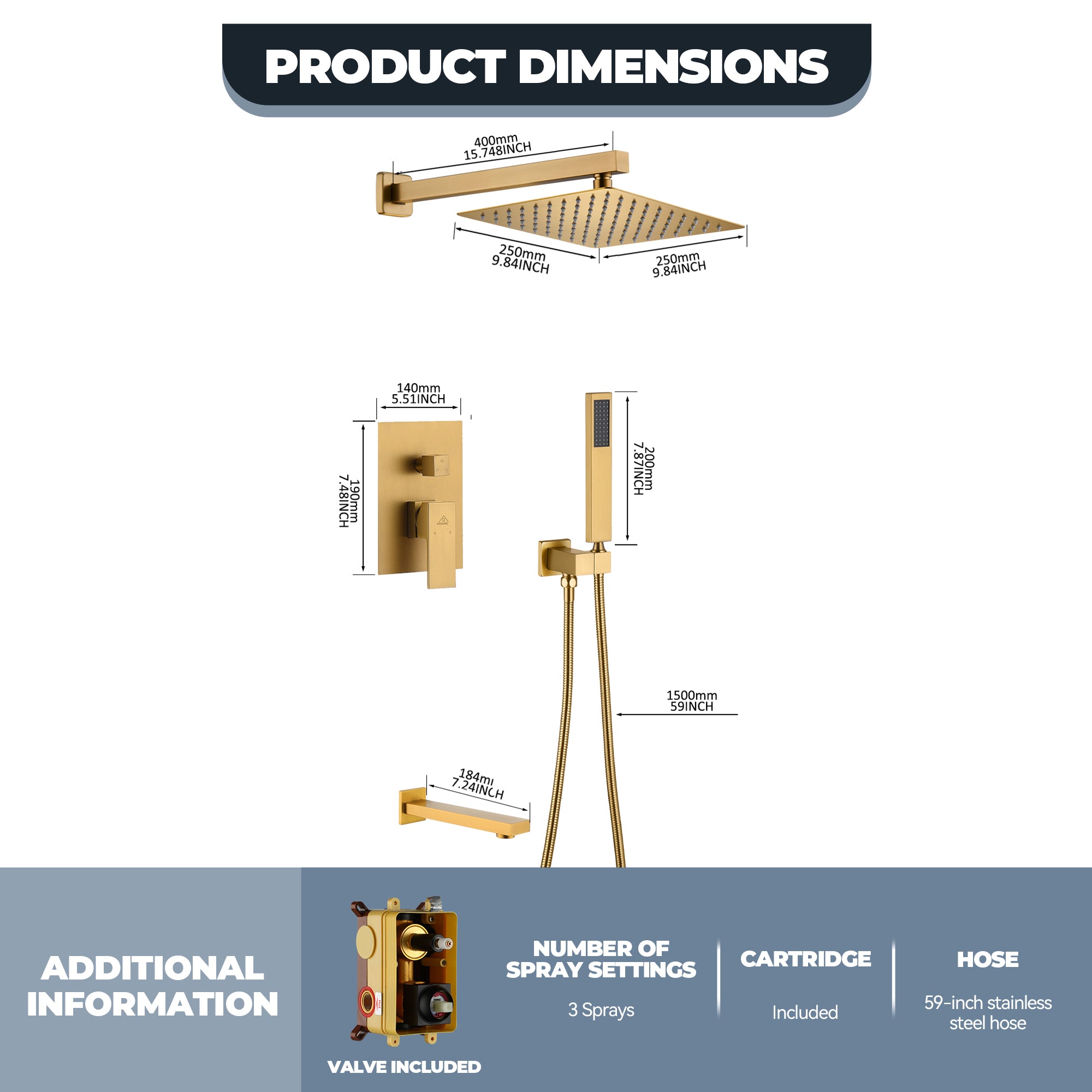 This wall-mounted 3-function single shower rain system is made of brass, and the square stainless steel shower has a high-level appearance and long-lasting durability. CUPC-certified valve included, a Stainless steel hand shower with a 59-inch hose, 15-inch shower arm, and tub spout. The whole set of shower systems will bring you an advanced shower experience and wash away all-day fatigue.