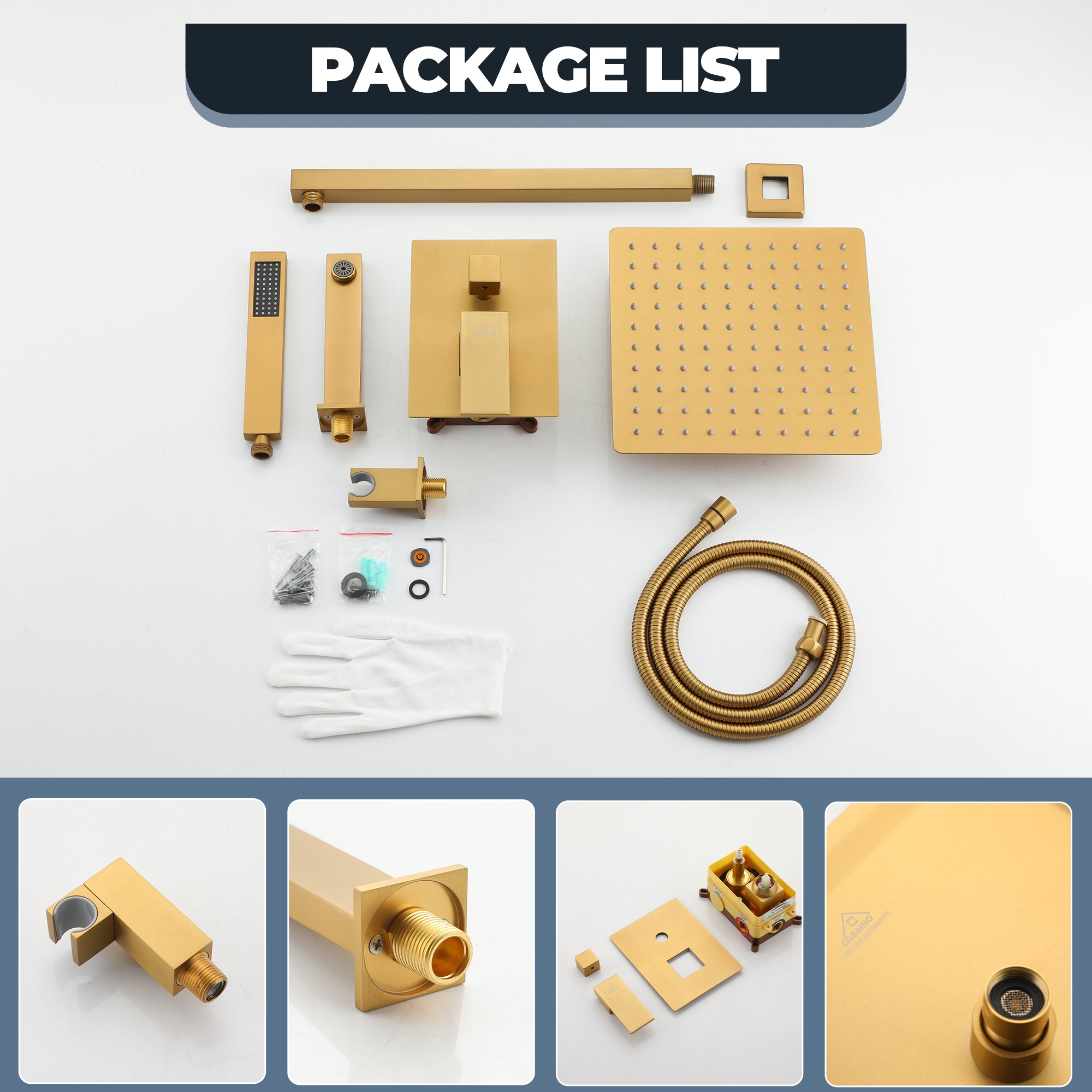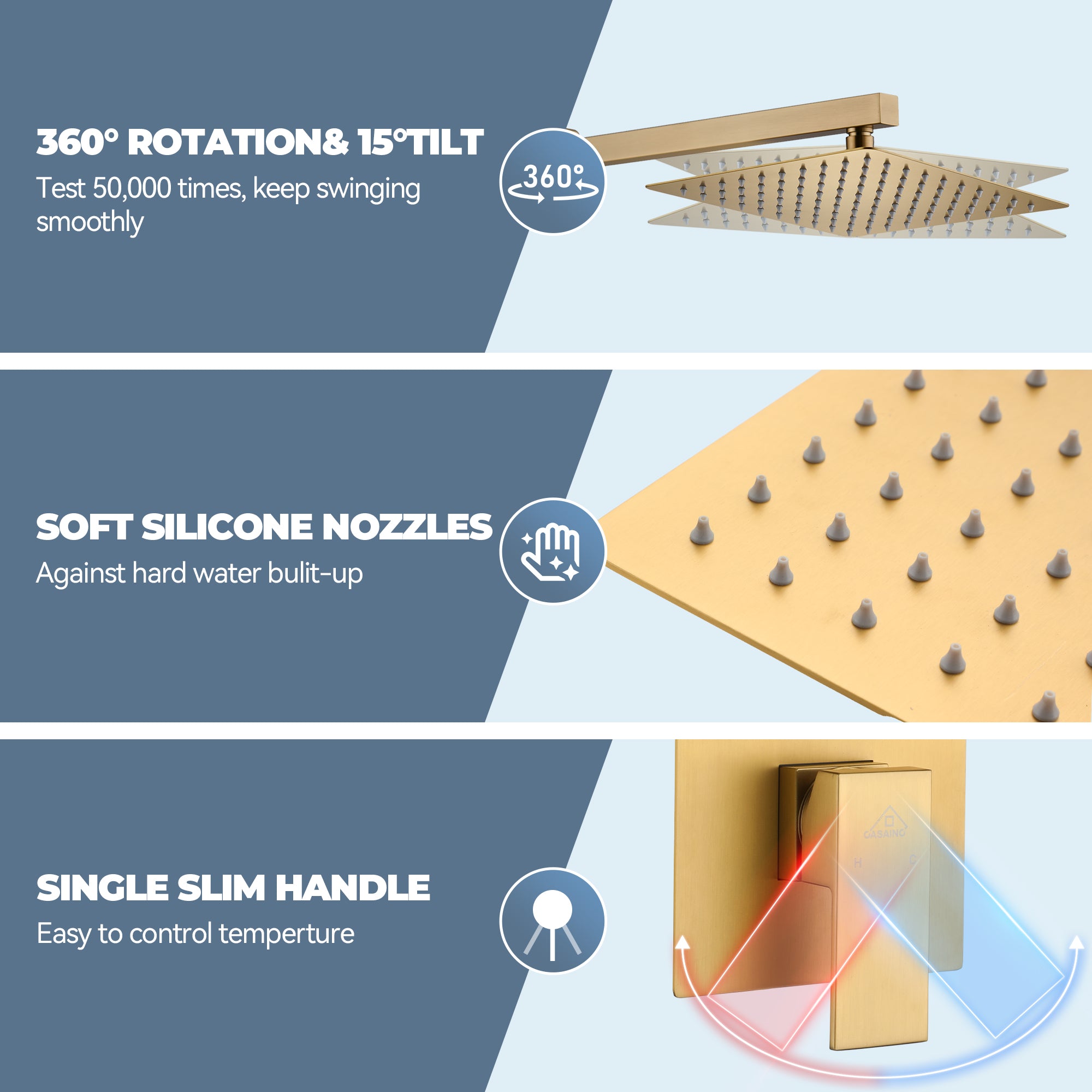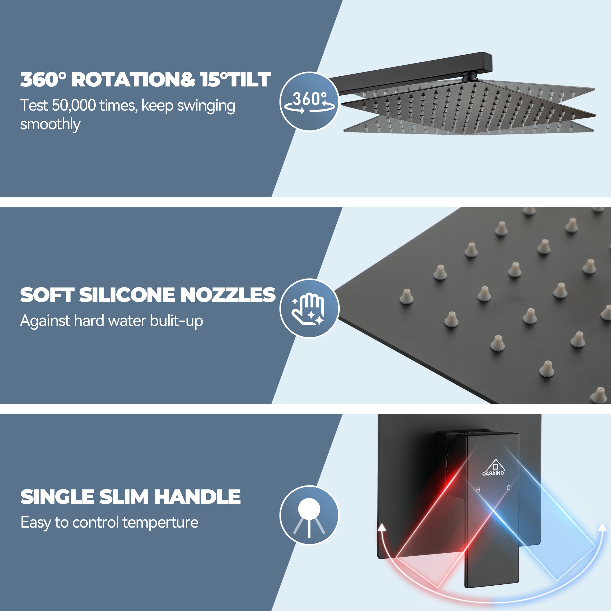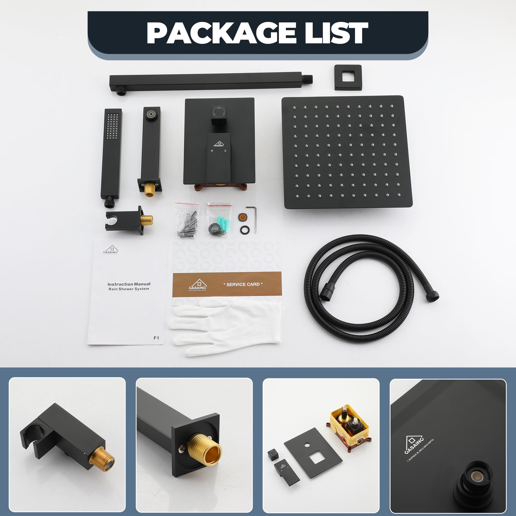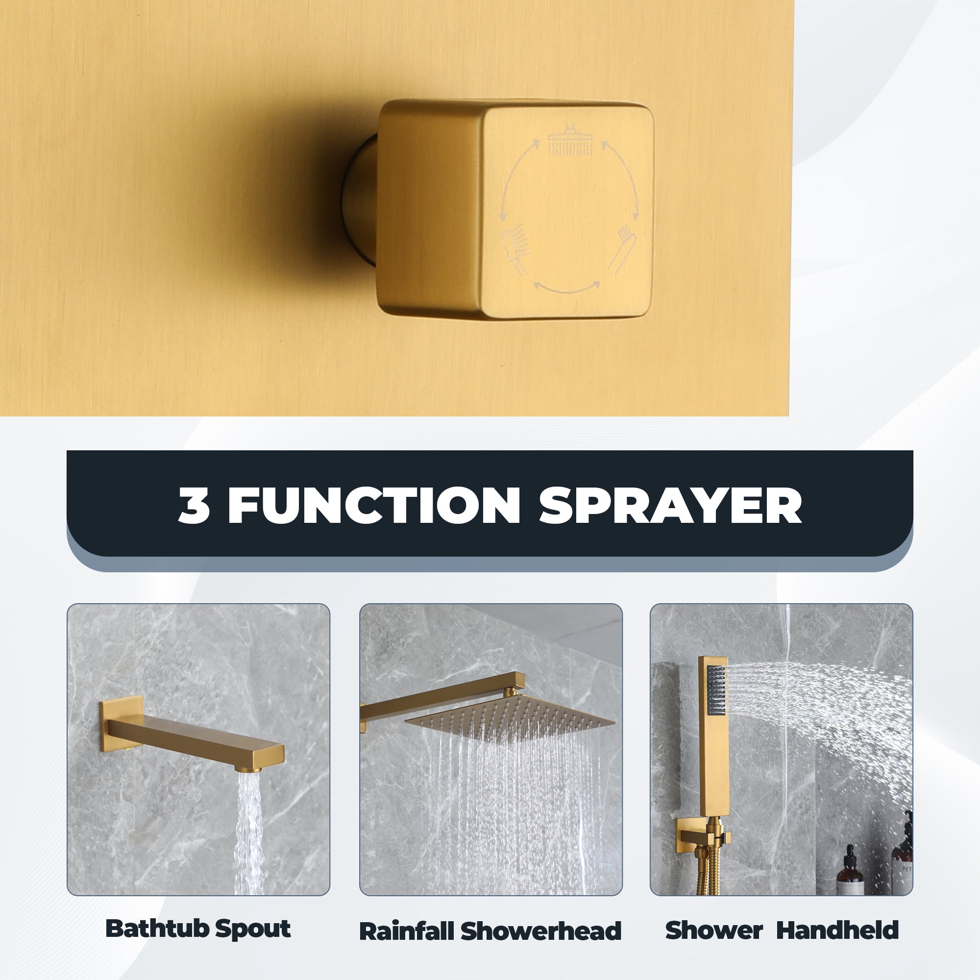 This wall-mounted 3-function single shower rain system is made of brass, and the square stainless steel shower has a high-level appearance and long-lasting durability. CUPC-certified valve included, a Stainless steel hand shower with a 59-inch hose, 15-inch shower arm, and tub spout. The whole set of shower systems will bring you an advanced shower experience and wash away all-day fatigue.