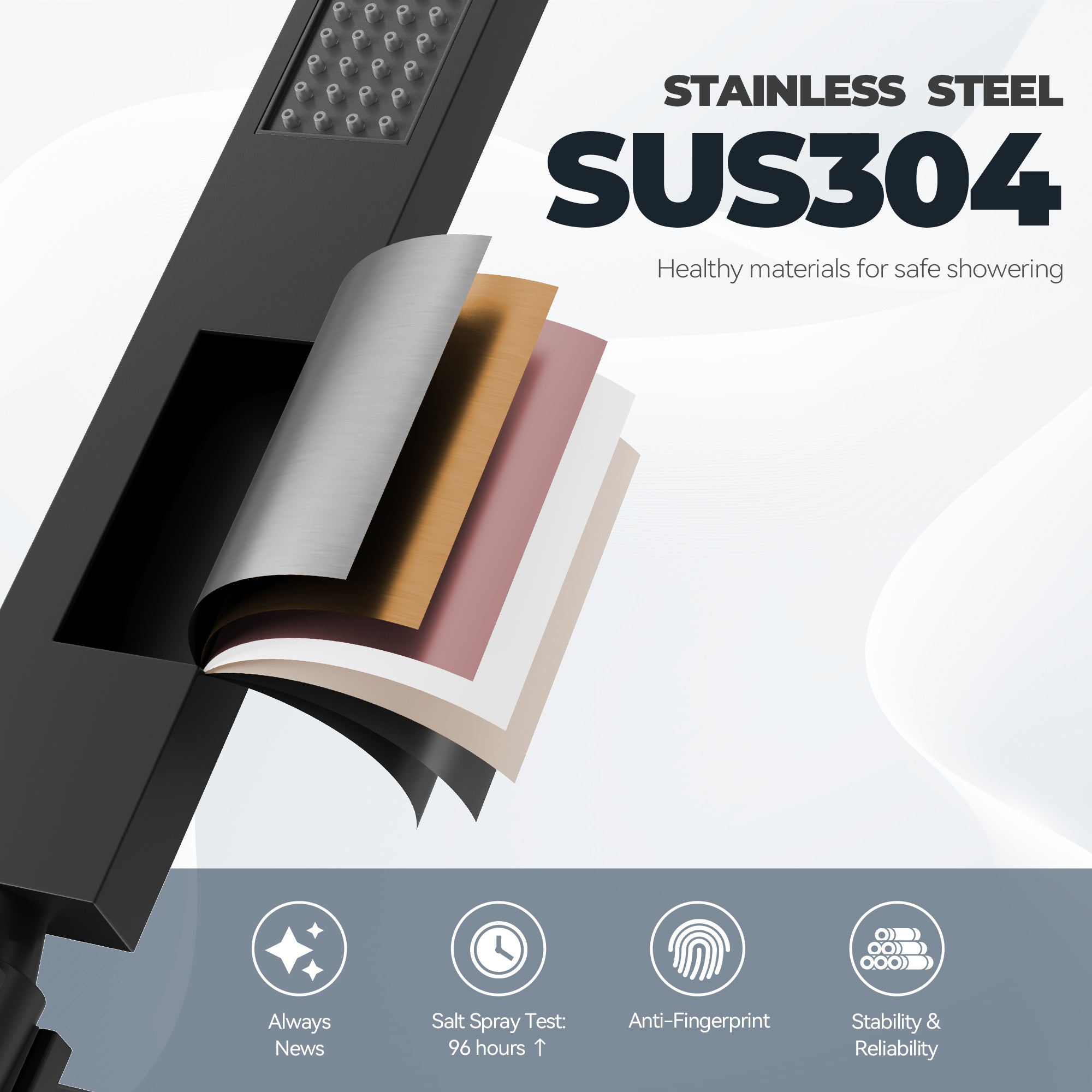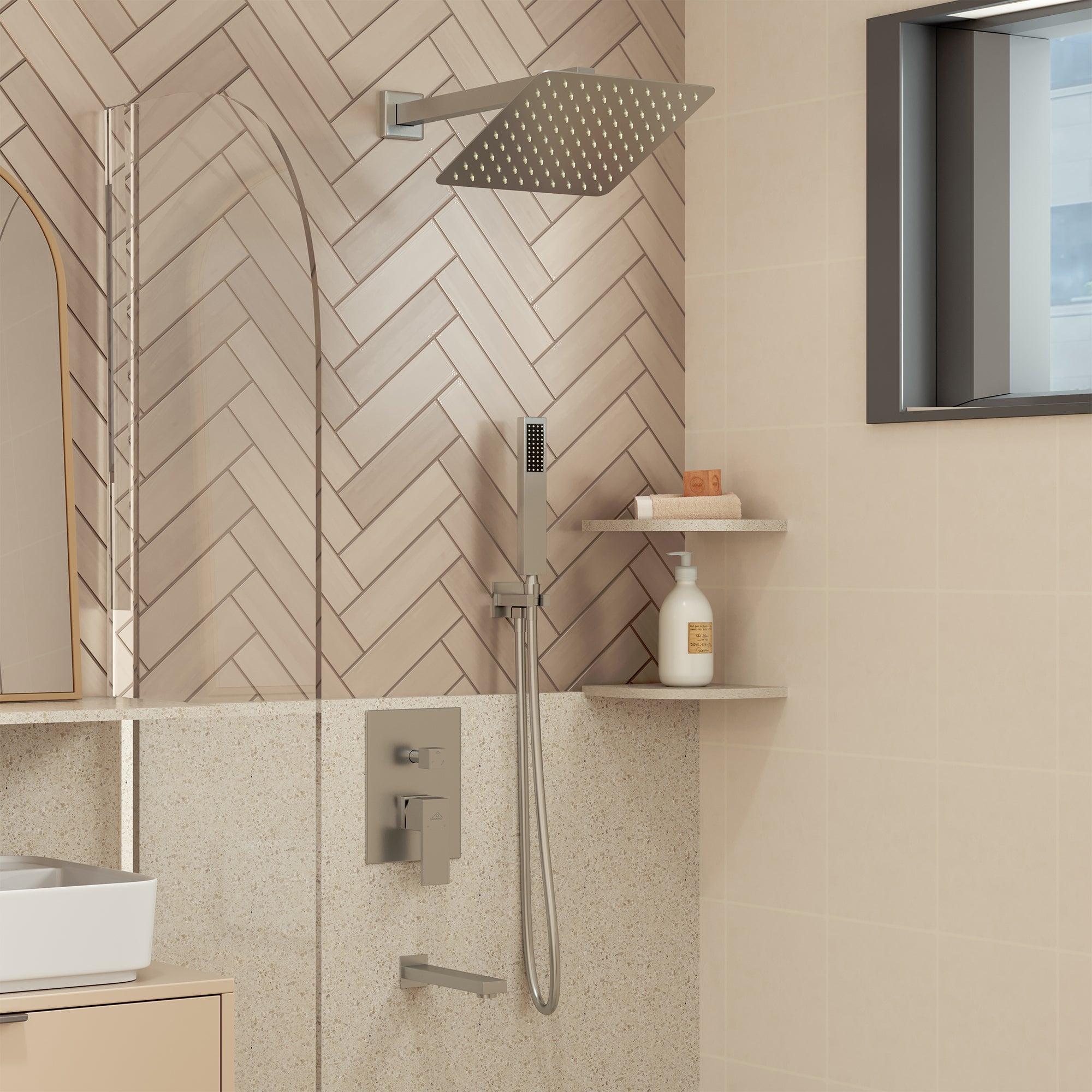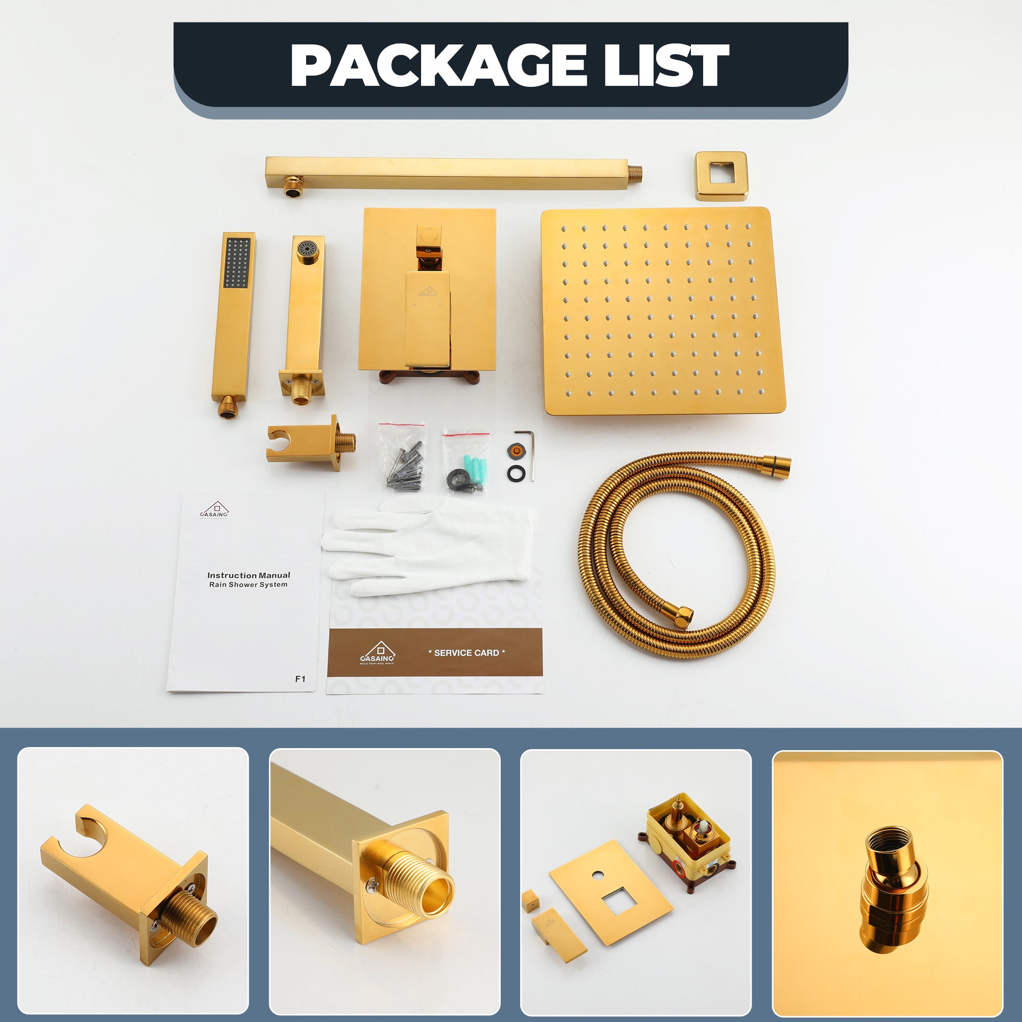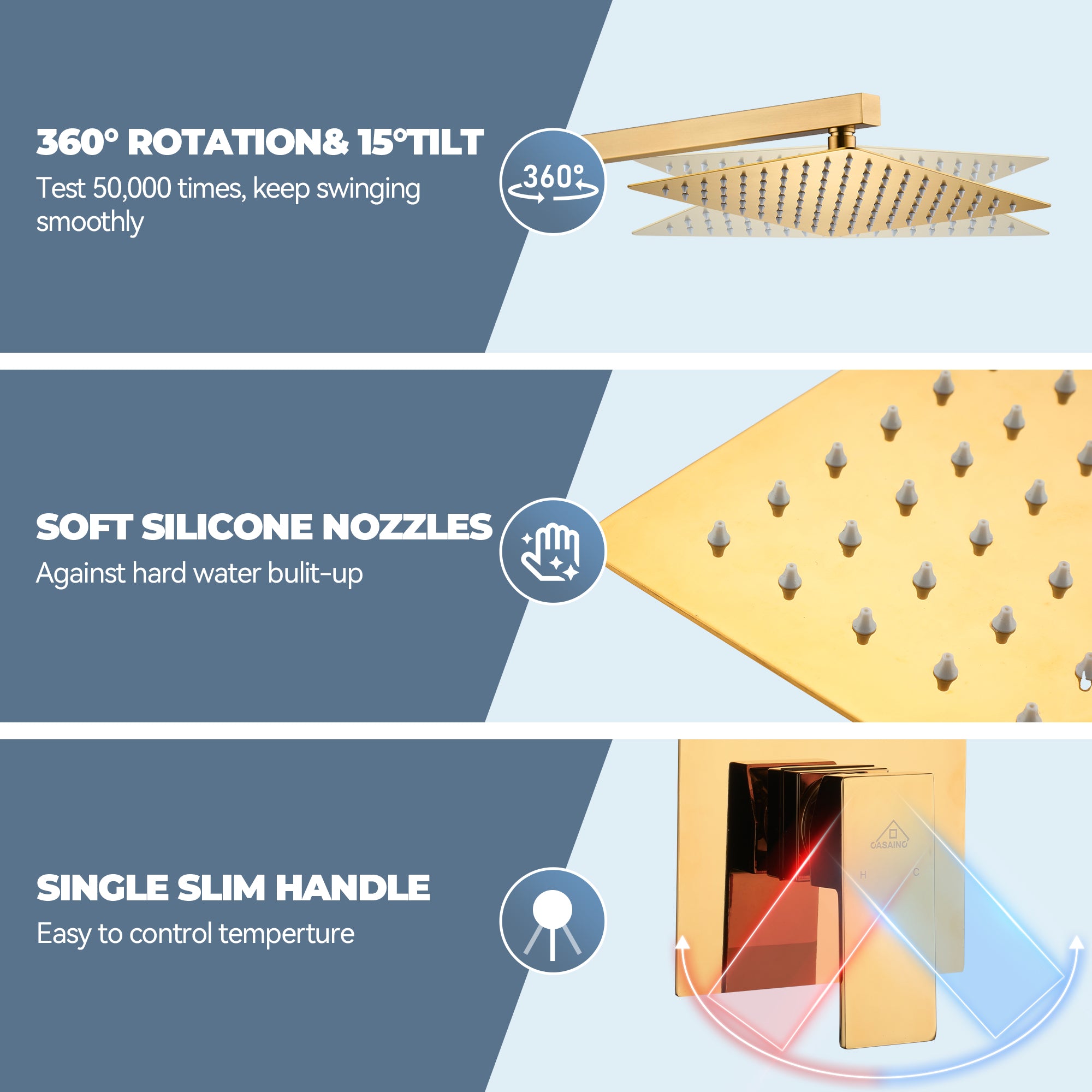 This wall-mounted 3-function single shower rain system is made of brass, and the square stainless steel shower has a high-level appearance and long-lasting durability. CUPC-certified valve included, a Stainless steel hand shower with a 59-inch hose, 15-inch shower arm, and tub spout. The whole set of shower systems will bring you an advanced shower experience and wash away all-day fatigue.
