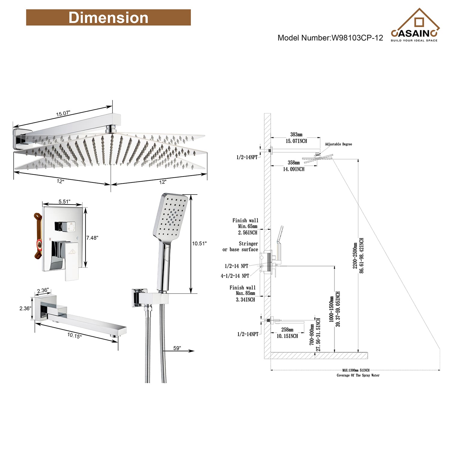 - Complete Set with Tub Spout: Includes rainfall shower head, 3-function handheld, 59-inch hose, 15-inch shower arm, pre-embedded valve, tub spout, and mounting accessories.