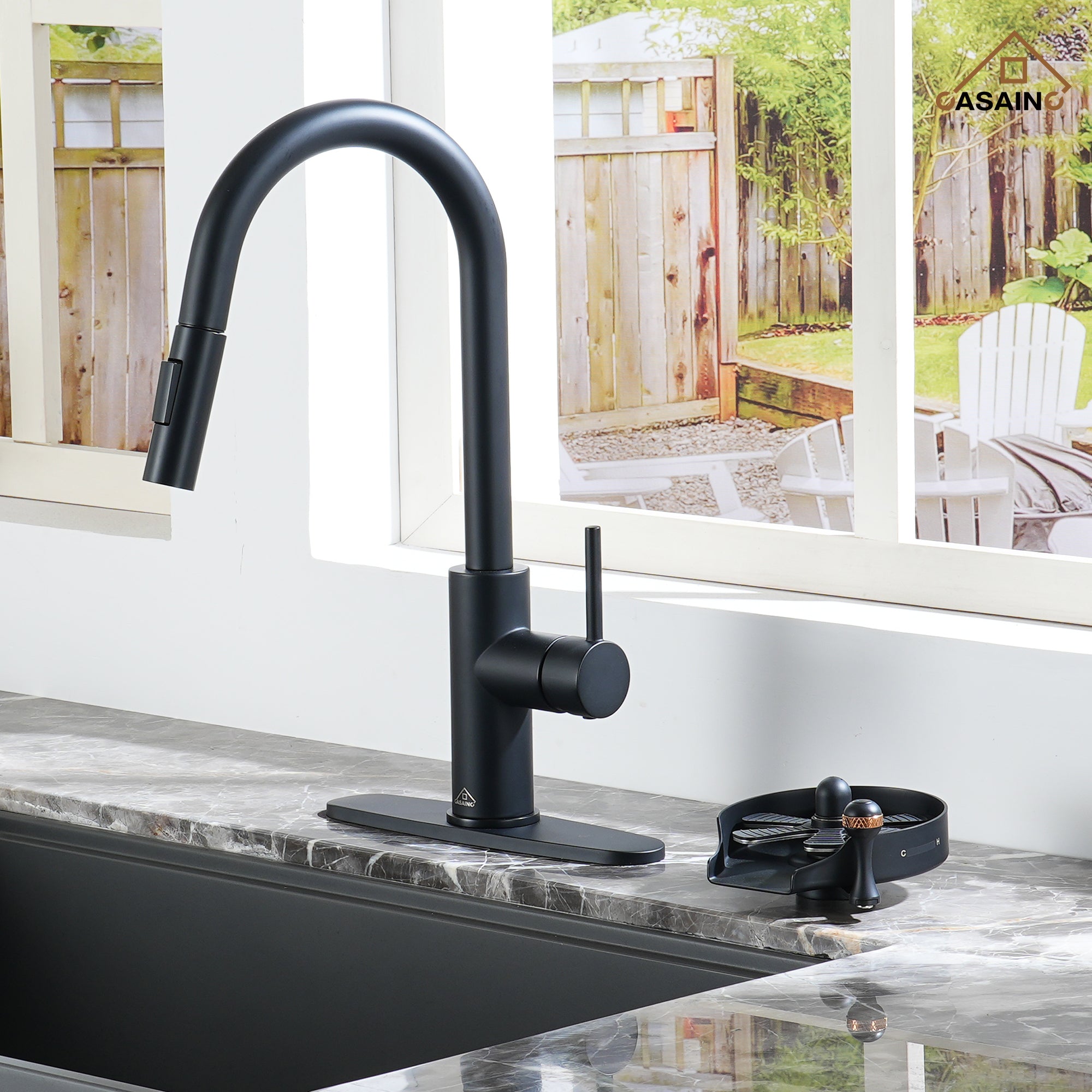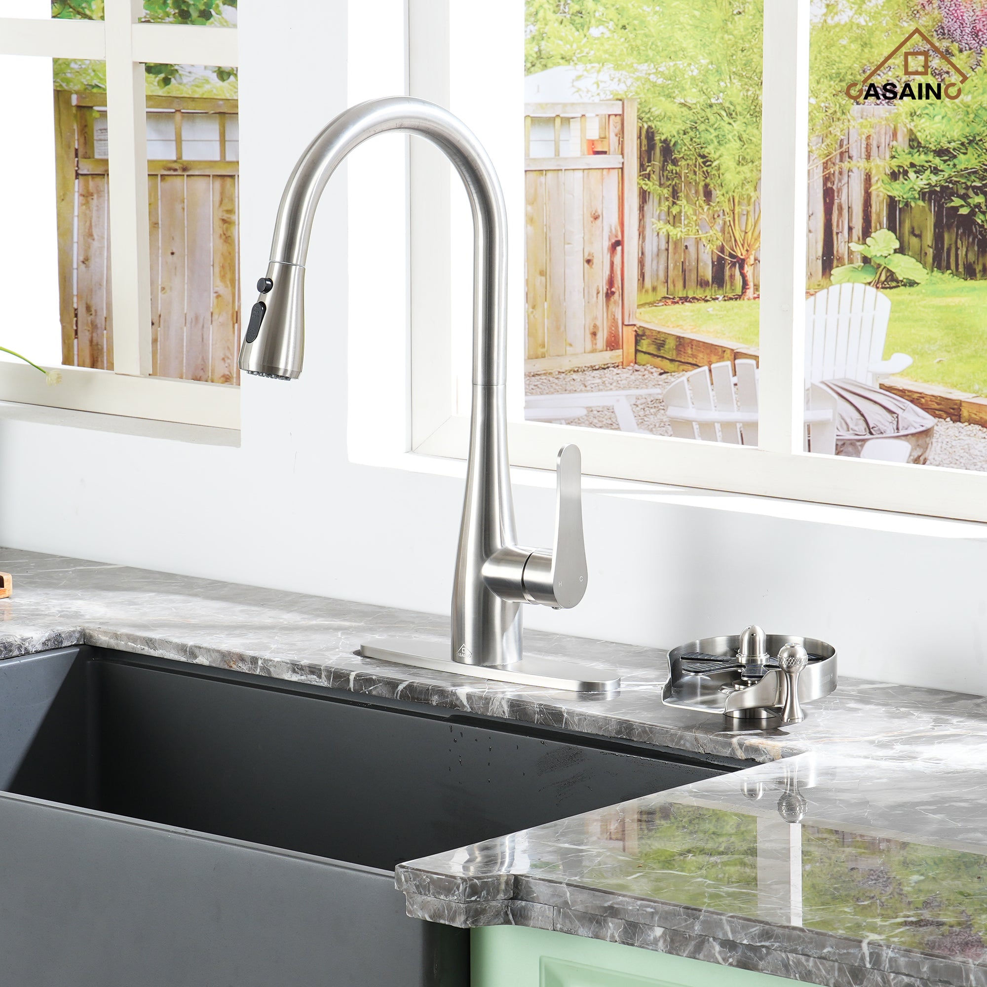 - Sleek, unique design allows the glass rinser to pair seamlessly with any existing faucet or kitchen design